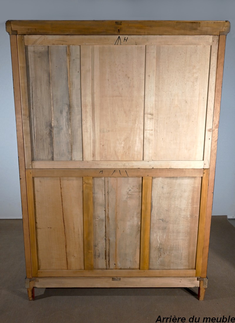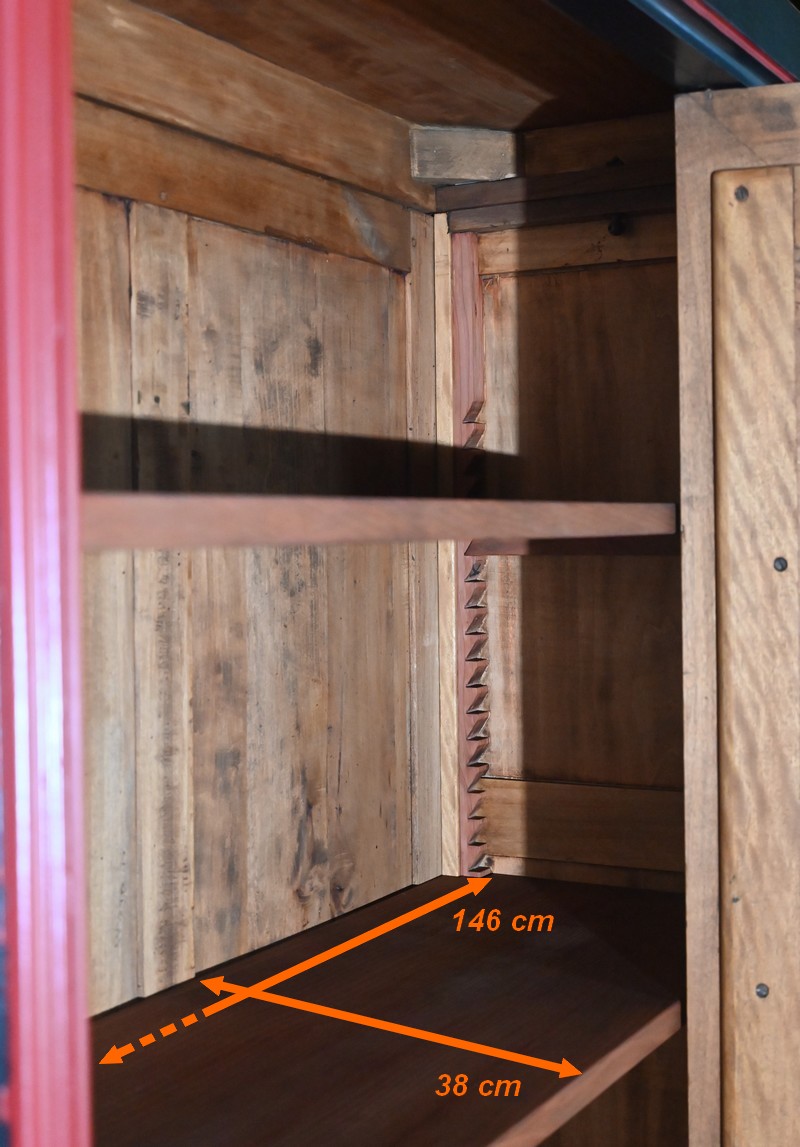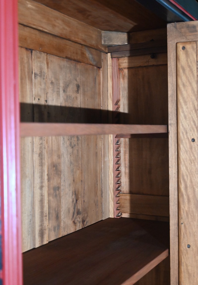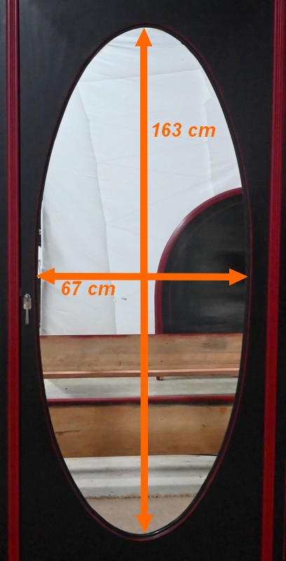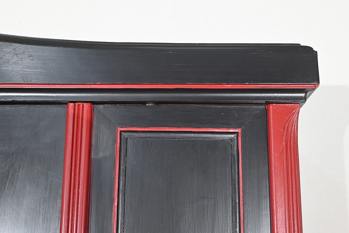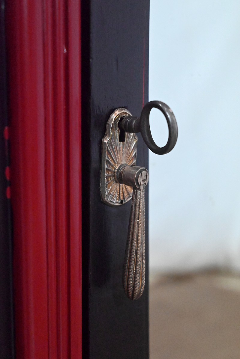 Elle ouvre par une importante porte centrale. Celle-ci est flanquée d’un miroir ovale au mercure et est équipée d’une serrure fonctionnelle d’origine avec clé, entrée et pendentif en bronze ciselé. Latéralement réparties, deux fausses portes, composées chacune d’un grand panneau et d’un plus petit, viennent habiller la façade.