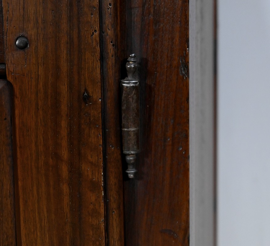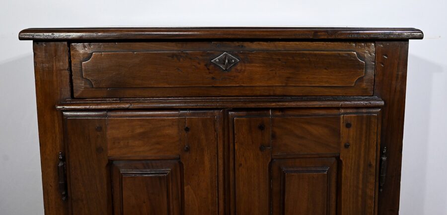 Rare meuble du XVIIIe siècle, en noyer massif de petit dimensionnel, pourvu en façade d’un tiroir, muni d’un pourtour à défoncement avec angles concaves.