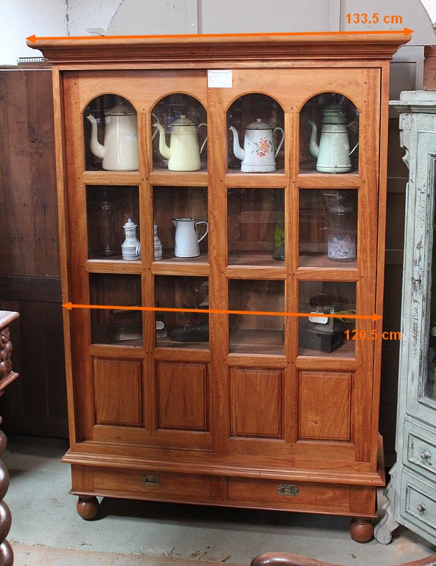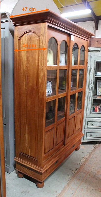 Bibliothèque en acajou blond massif ouvrant par 2 portes coulissantes et 2 tiroirs en partie basse avec poignées laiton.