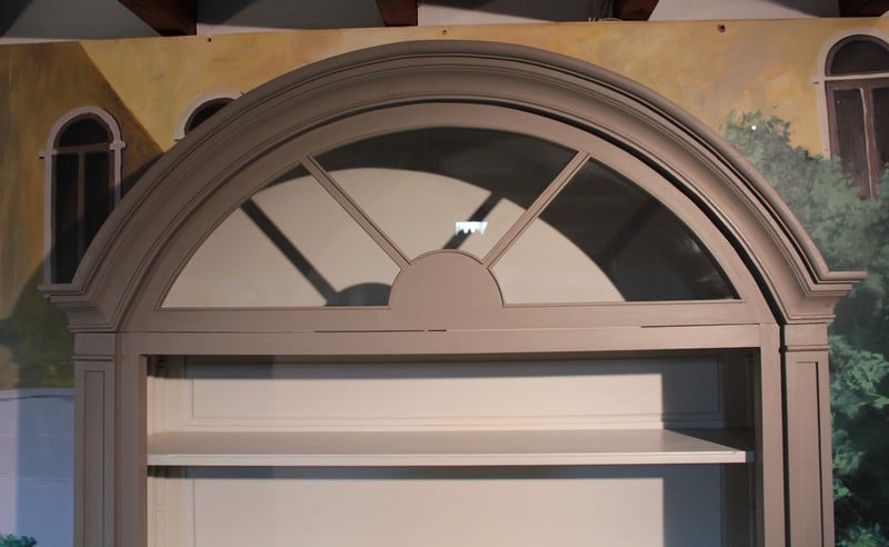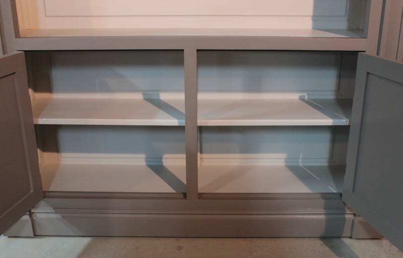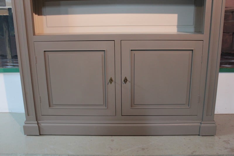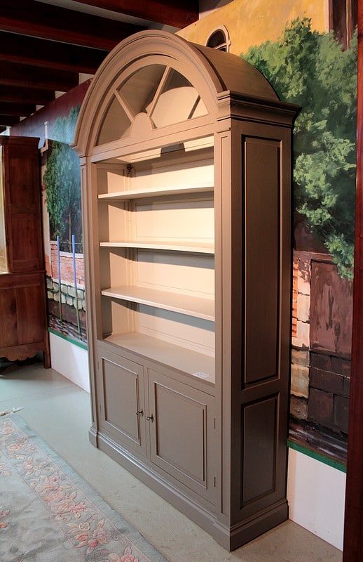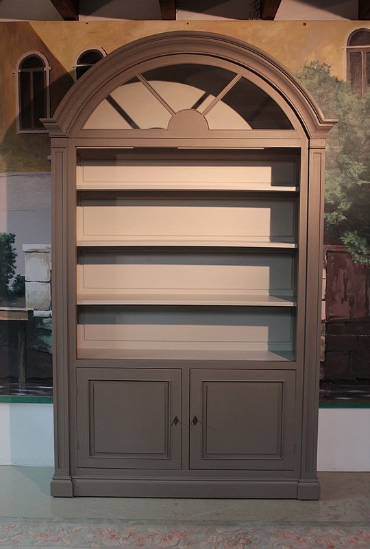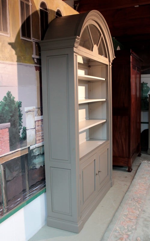 Bibliothèque à imposte vitrée en partie haute, patinée gris. Elle ouvre par 2 portes en partie basse surmontée d’une partie ouverte à 3 étagères. Meuble démontable. Fabrication XXe.