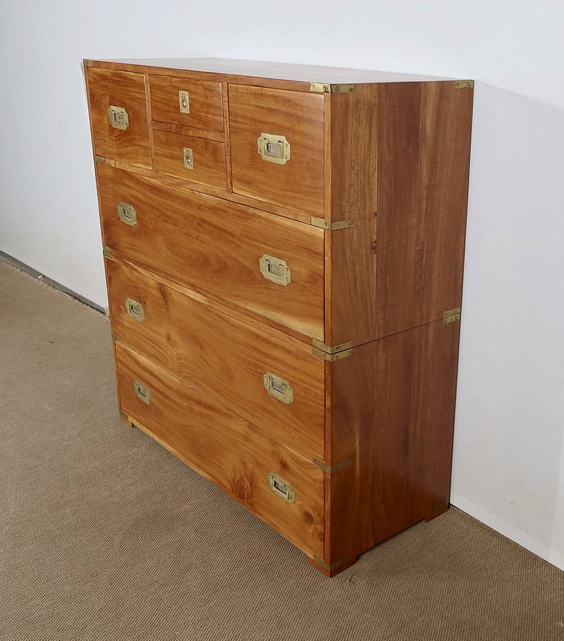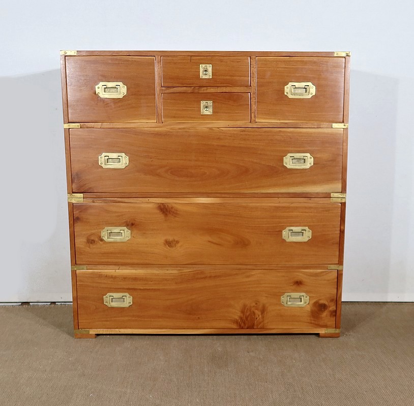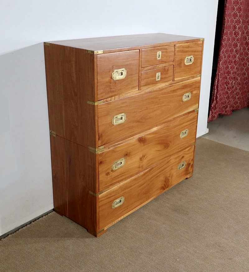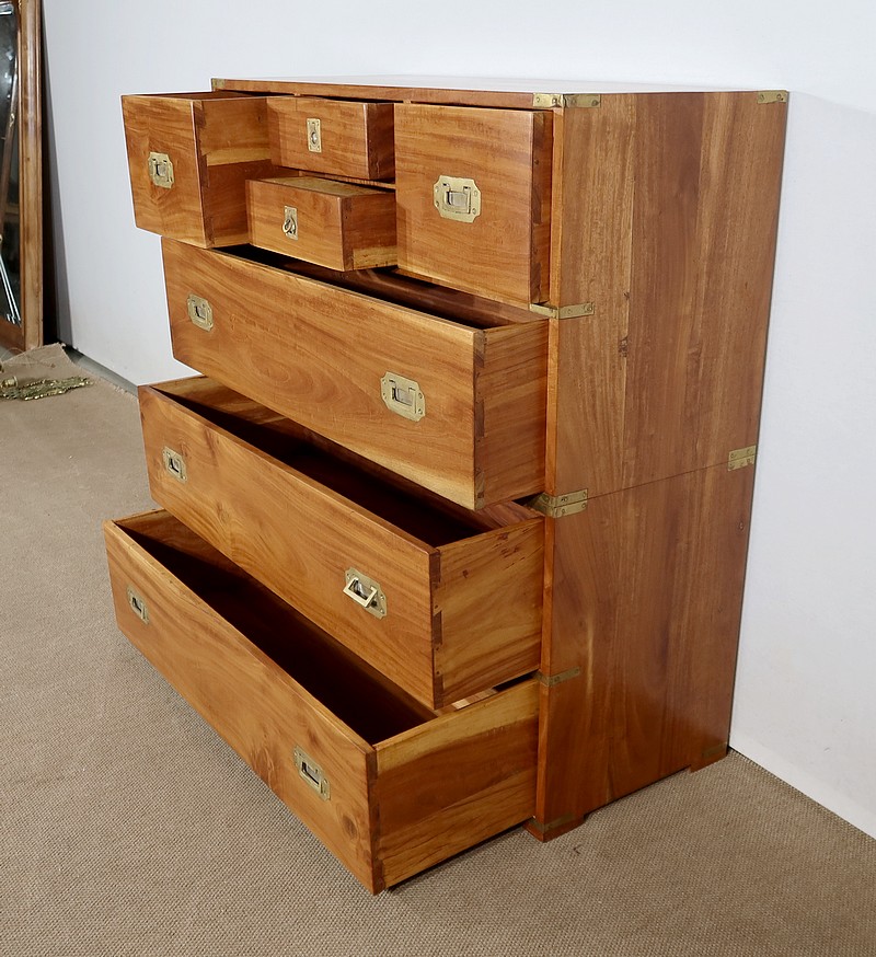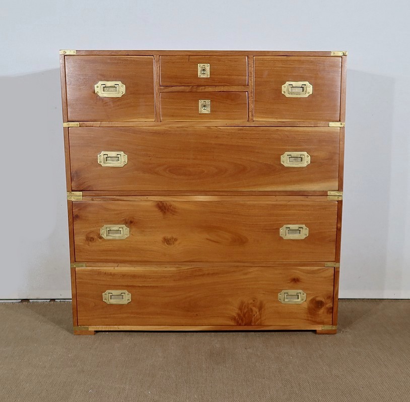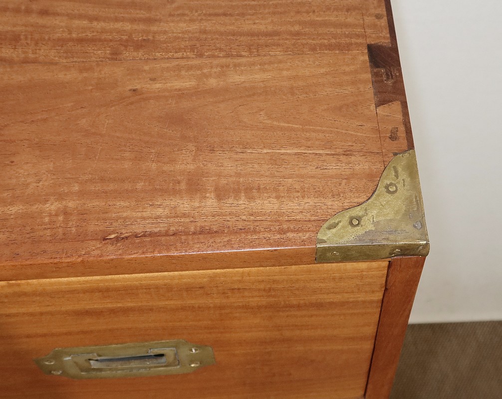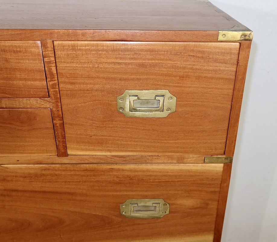 Belle reproduction d’une commode de Pondichéry en acajou massif réalisée entièrement avec du bois de récupération issu des demeures coloniales indiennes. Cette essence ancienne de grande qualité est un bois qui ne travaille plus, assurant stabilité et solidité. Une magnifique patine apporte protection et brillance.