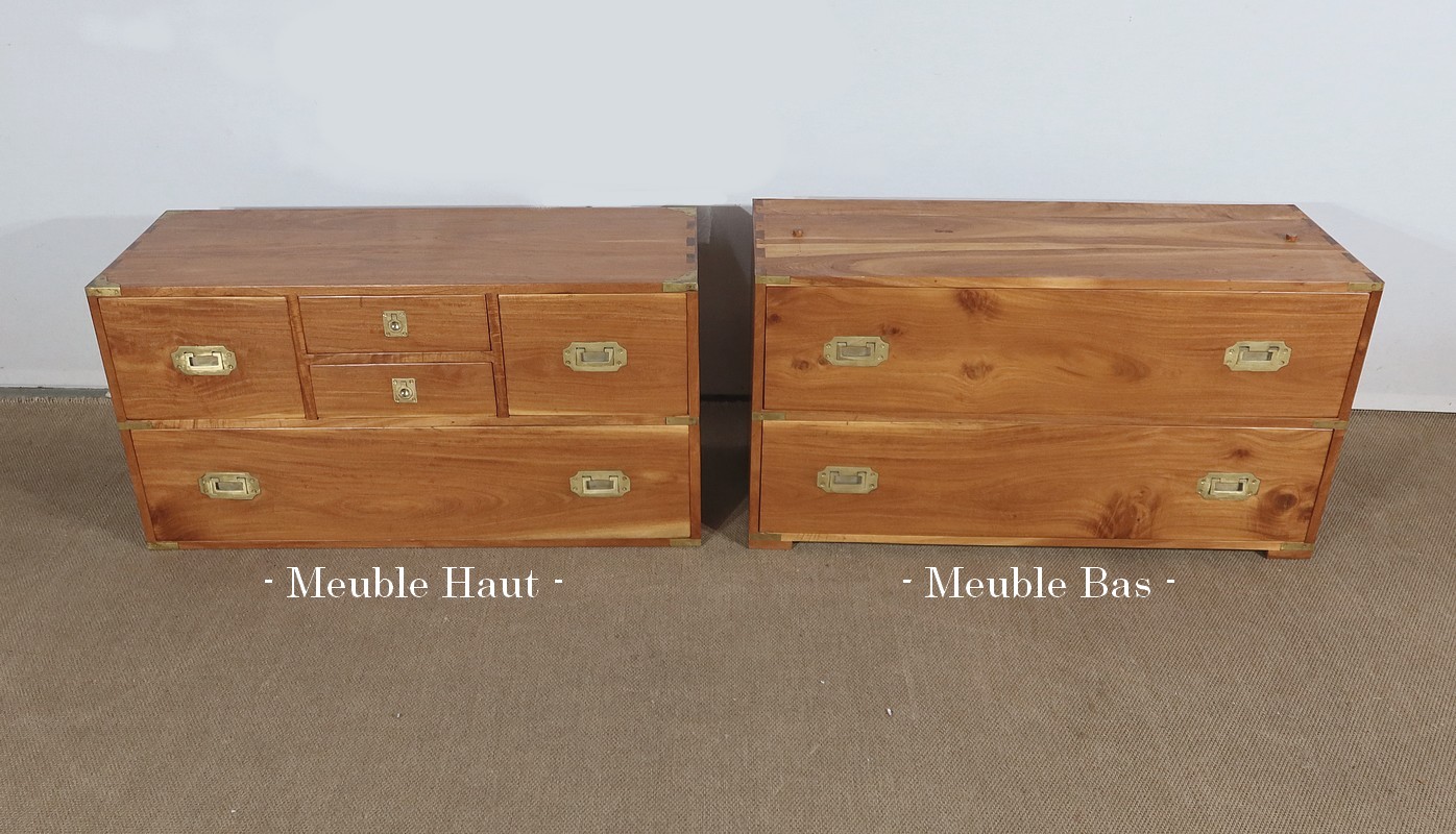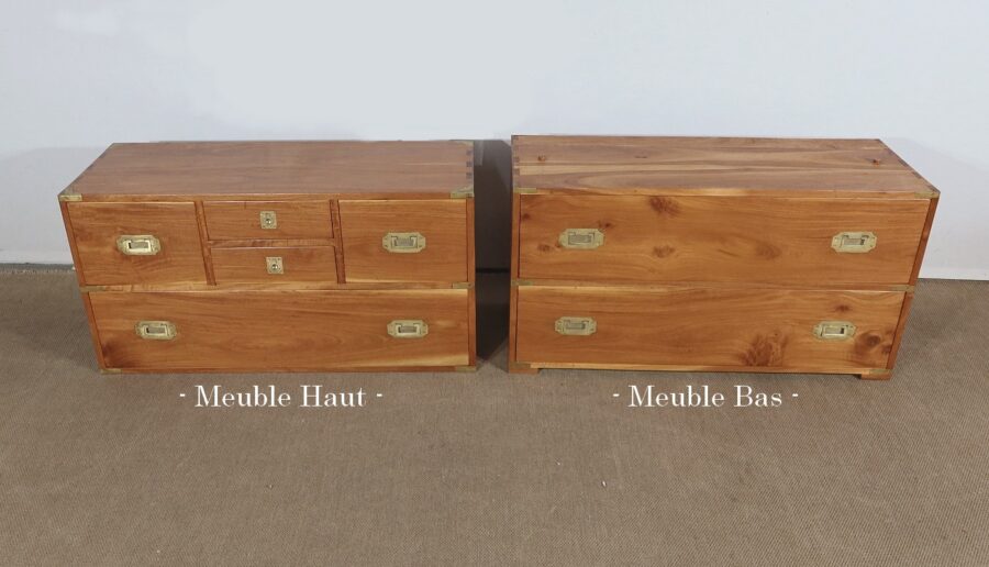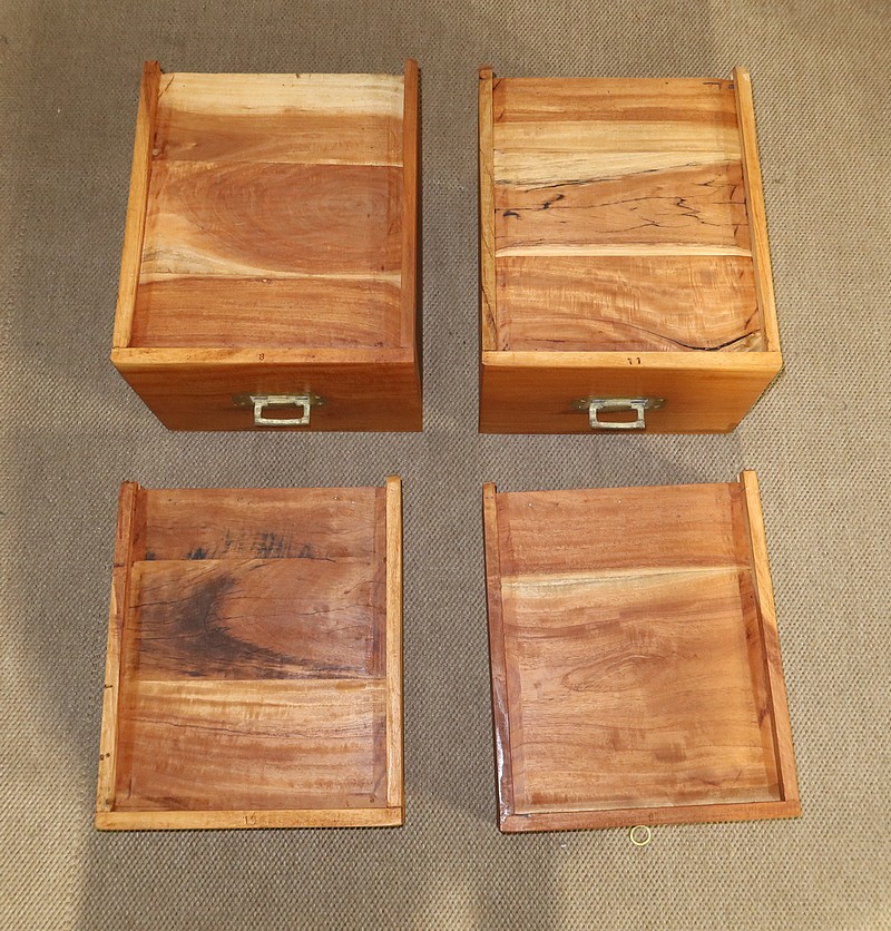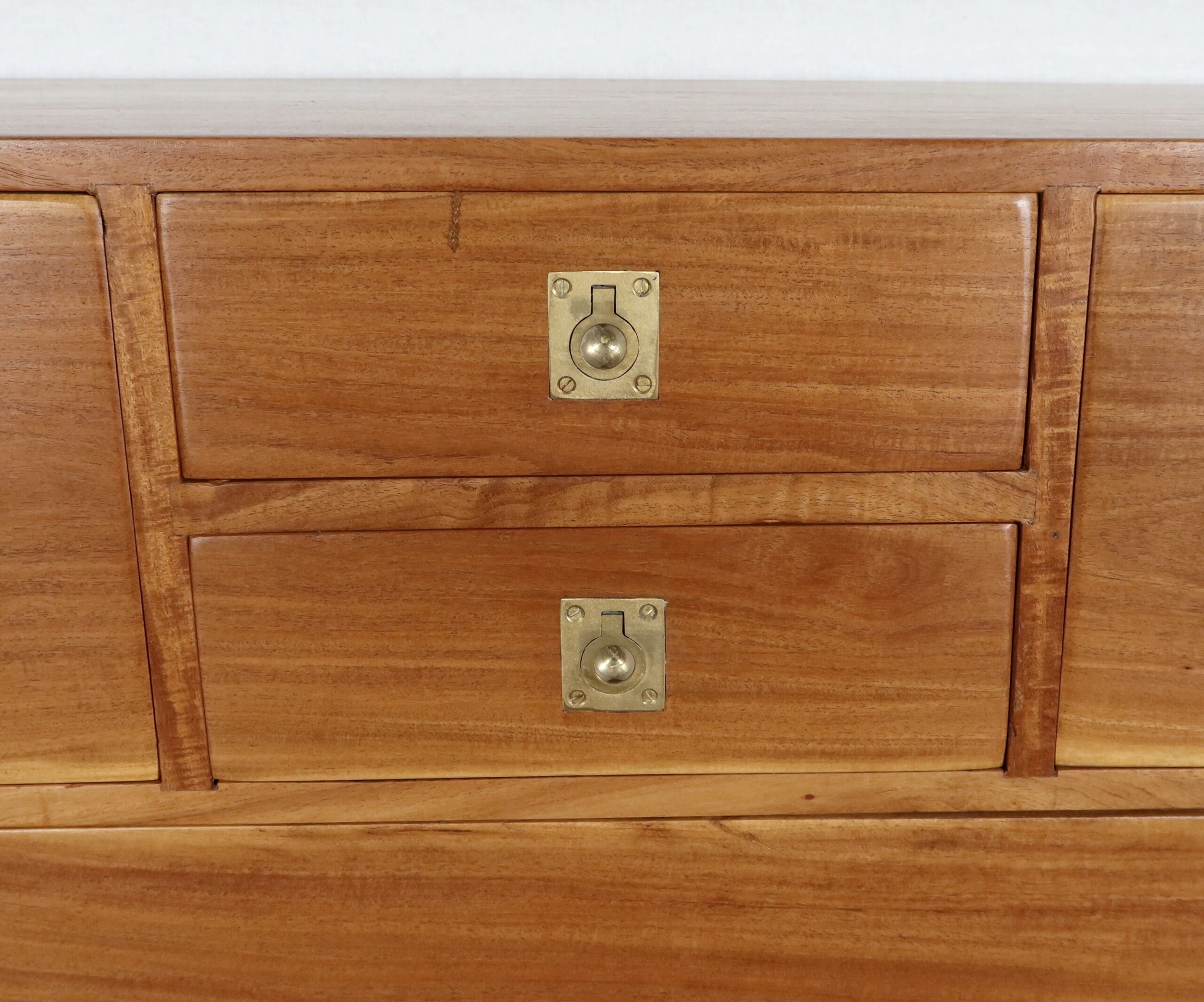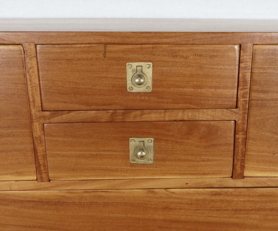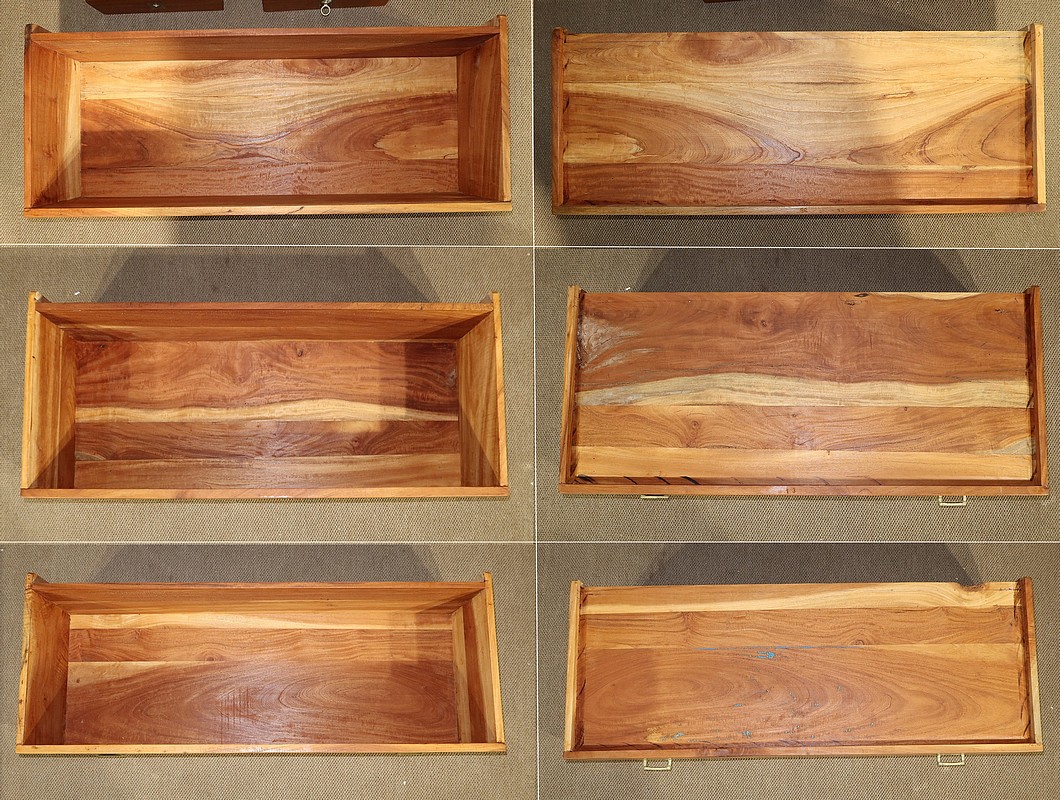 La façade de ce mobilier se divise en deux éléments distincts : le premier bloc ouvre par 5 tiroirs dont en partie haute 2 petits centraux superposés l’un sur l’autre, profond de 31 cm et haut de 7 cm. Un tiroir de chaque côté puis un grand au dessous, offrent chacun une profondeur de 31 cm et une hauteur intérieure de 19.5 cm.