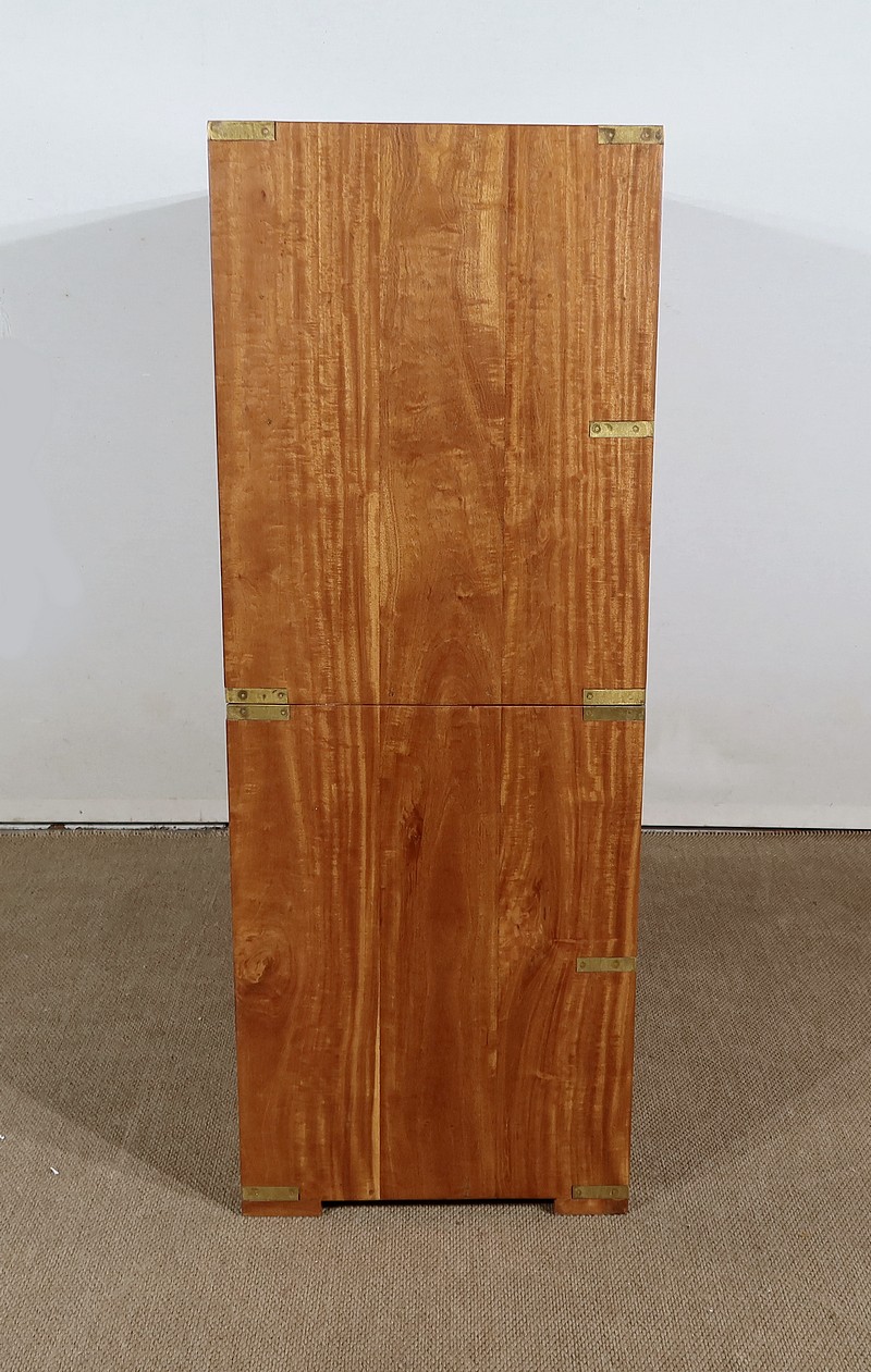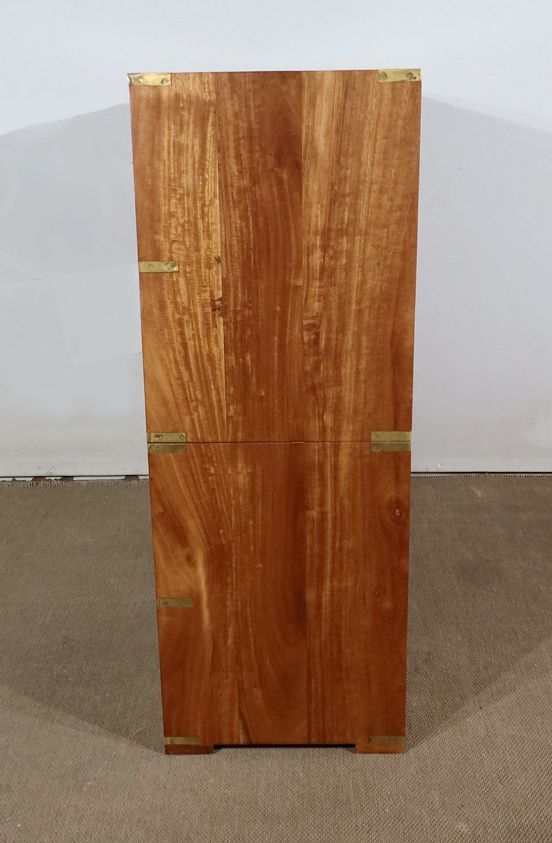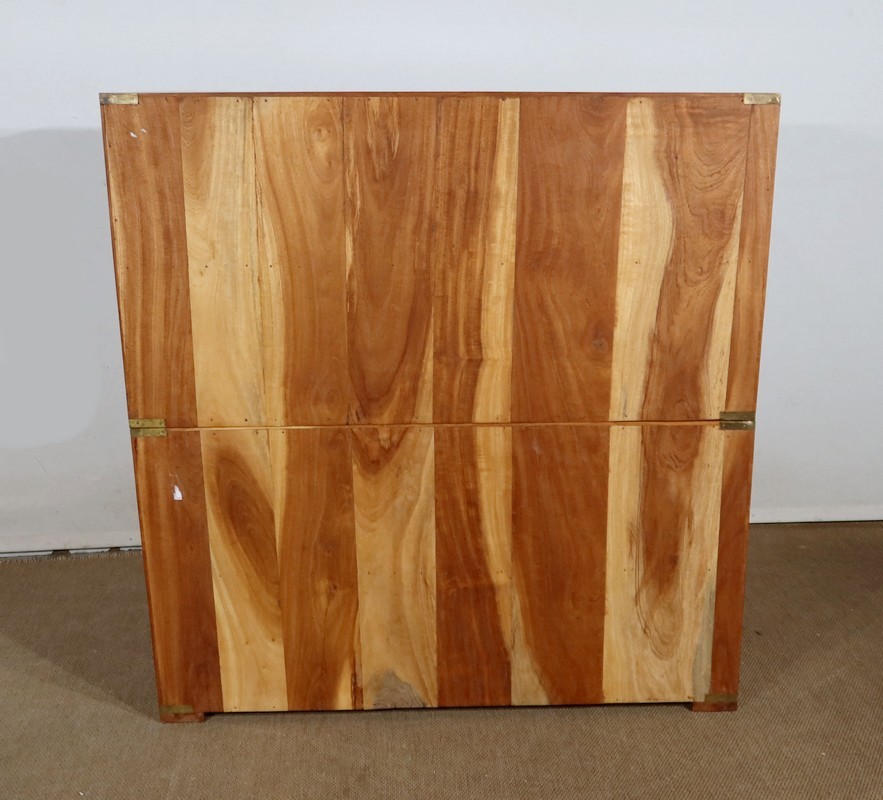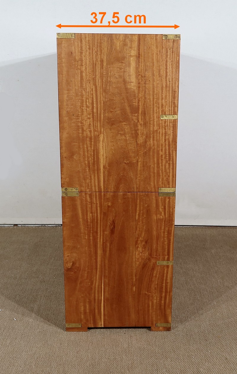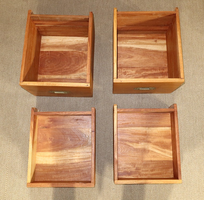 La façade de ce mobilier se divise en deux éléments distincts : le premier bloc ouvre par 5 tiroirs dont en partie haute 2 petits centraux superposés l’un sur l’autre, profond de 31 cm et haut de 7 cm. Un tiroir de chaque côté puis un grand au dessous, offrent chacun une profondeur de 31 cm et une hauteur intérieure de 19.5 cm.