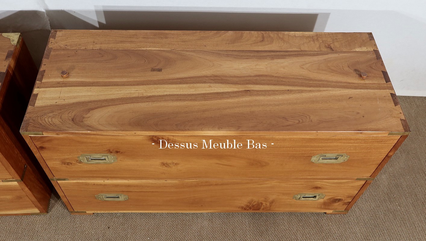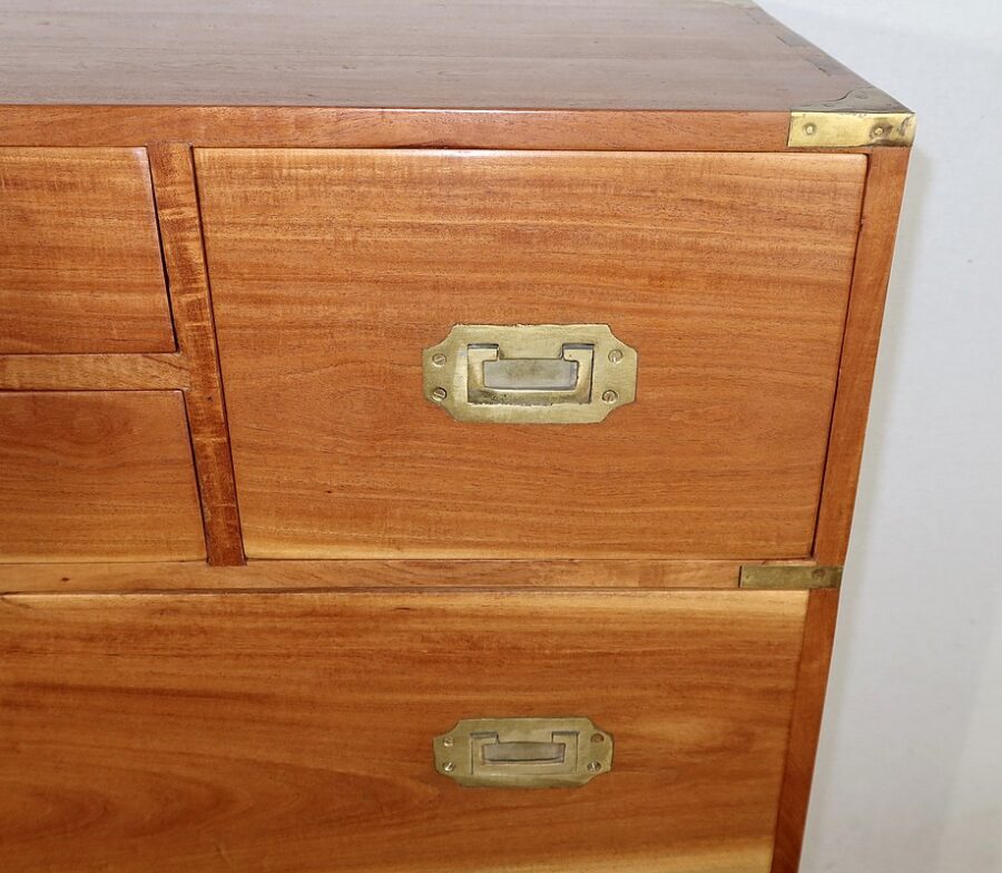 La seconde partie du corps se constitue de deux larges tiroirs munis de deux poignées en laiton, encastrées. Ces compartiments, ainsi que la structure de cette reproduction, sont montés à « queues d’arondes », assemblages apparents, notamment sur le Dessus du meuble, apportant une touche de Caractère supplémentaire.