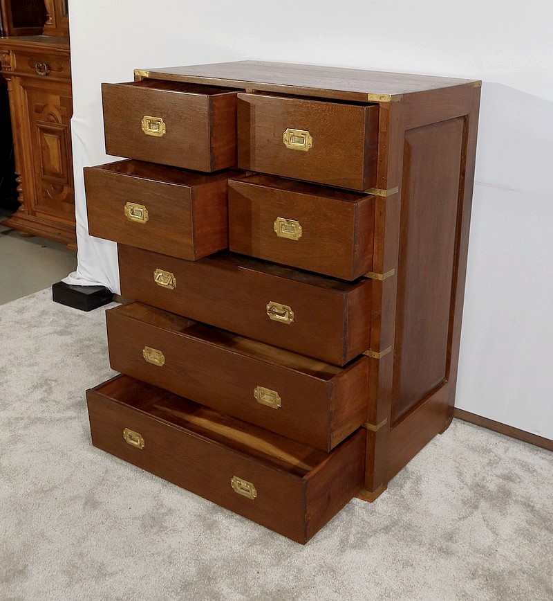 Belle reproduction d’une petite commode de Pondichéry en teck massif réalisée entièrement avec du bois de récupération issu des demeures coloniales indiennes. Cette essence ancienne de grande qualité est un bois qui ne travaille plus, assurant stabilité et solidité.