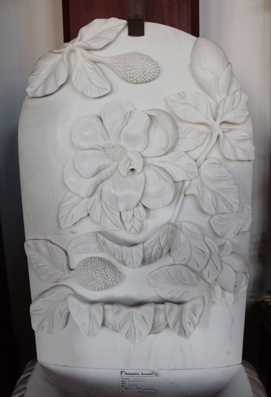 Fontaine en marbre blanc à décor de fleurs et de feuilles.