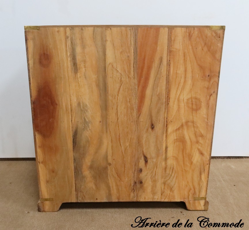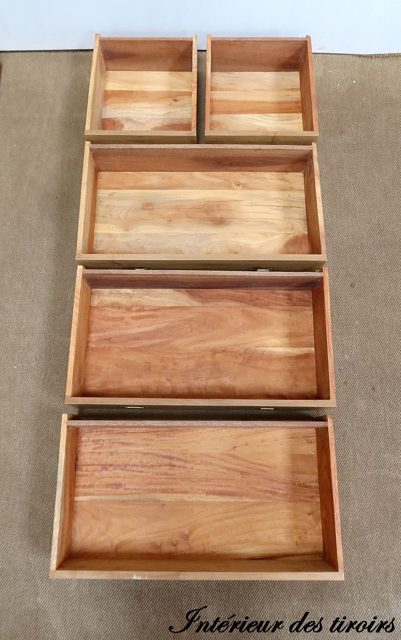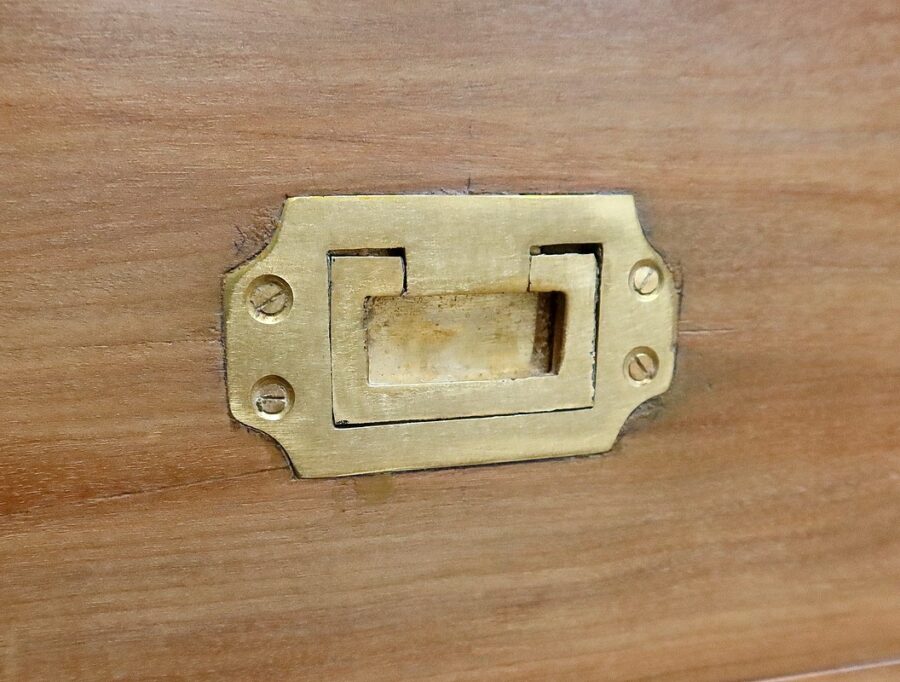 Ce meuble, de fait stable et solide, ouvre sur un premier rang par deux petits tiroirs, puis par trois plus grands. Leurs intérieurs sont en Acajou. Tous sont équipés de poignées de marine en laiton, encastrées et rabattables.