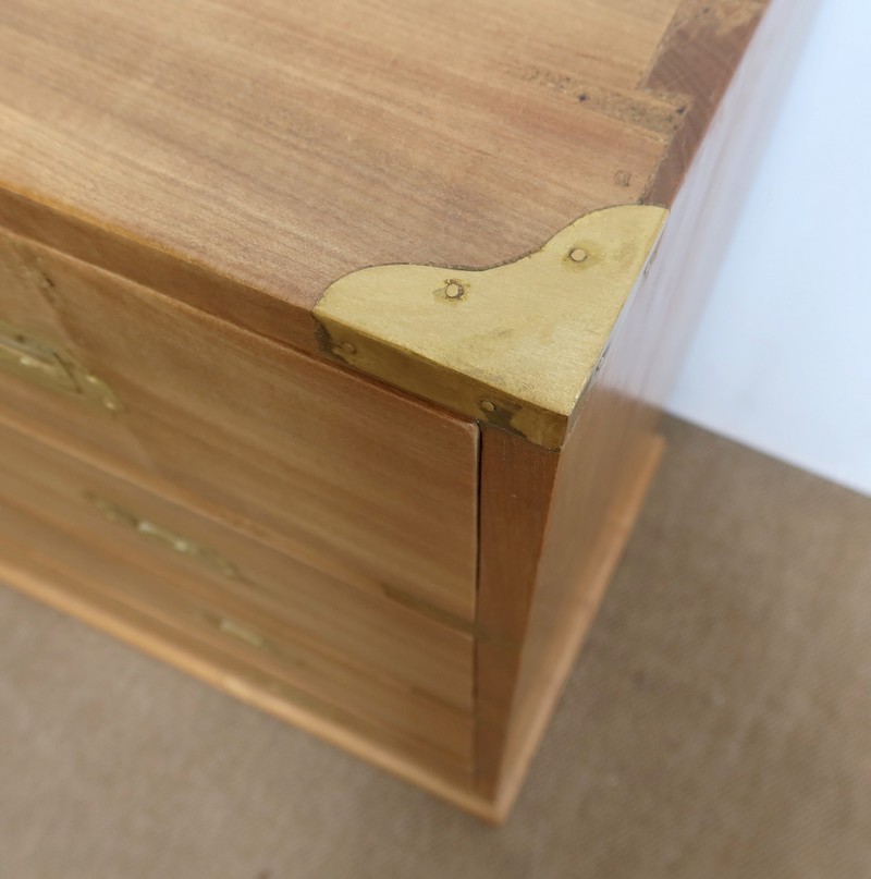 Les angles et les arêtes sont renforcés par des lanières en laiton qui, outre leur fonction de protection, finissent de personnaliser cette commode.