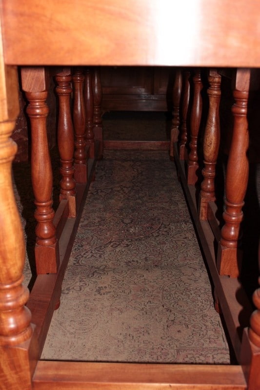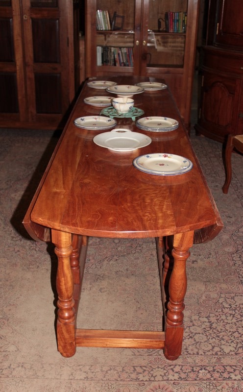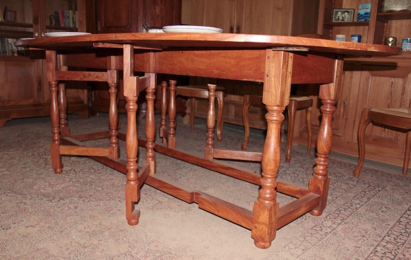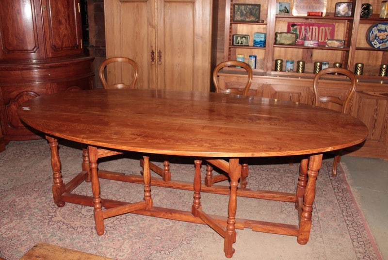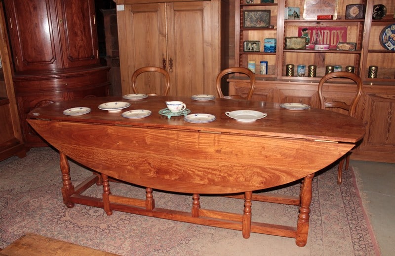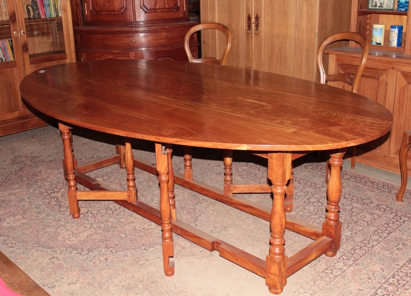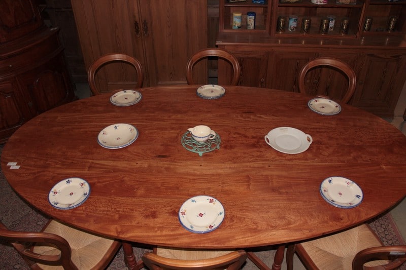 Très grande table ovale à abattants en acajou blond massif reposant sur un piètement à 4 pieds tournés et 4 paires de pieds tournés plus fins se dépliant. Elle peut accueillir 10 à 12 personnes.