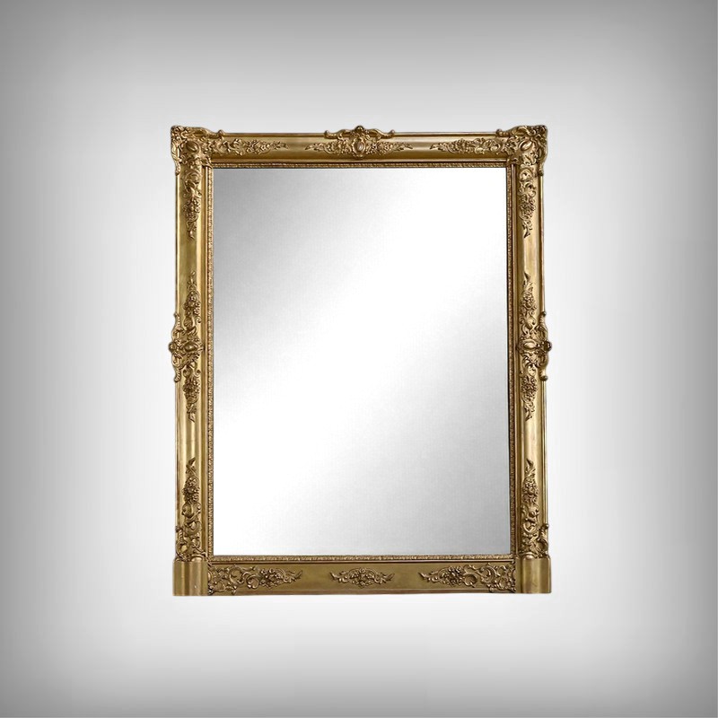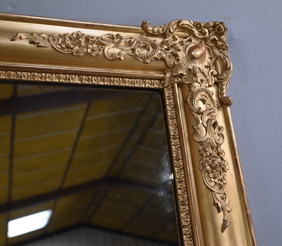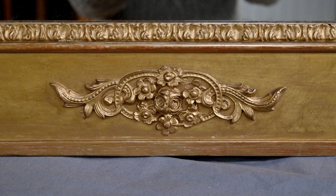 Grand miroir en bois et stuc doré de style Restauration, datant du XIXᵉ siècle, présentant une silhouette rectangulaire élancée et une ornementation raffinée. Son cadre, entièrement sculpté, est animé d’un décor de médaillons à coquille, de rameaux fleuris, de volutes et de rinceaux, travaillés avec une grande finesse et rehaussés d’une dorure chaleureuse.