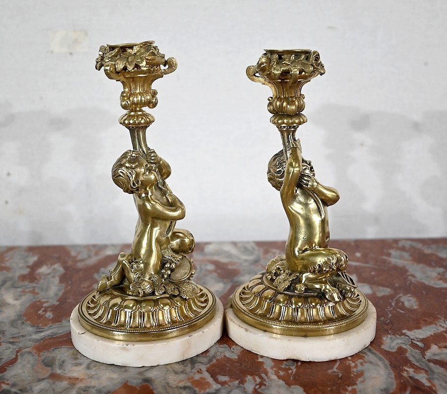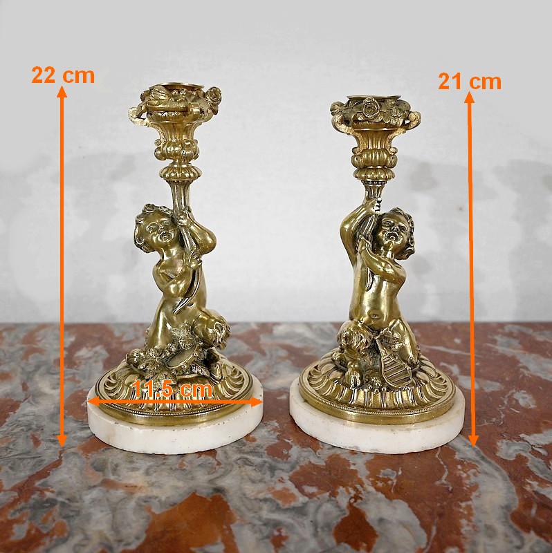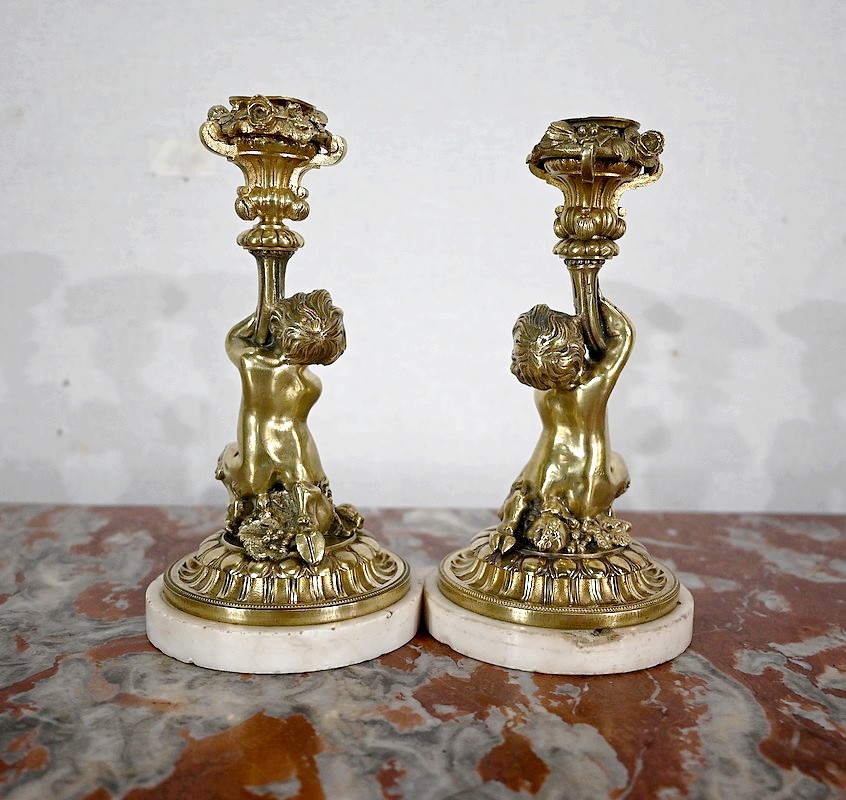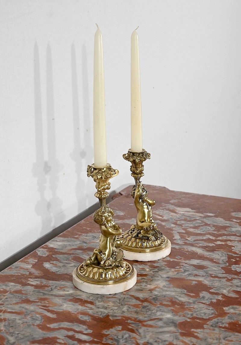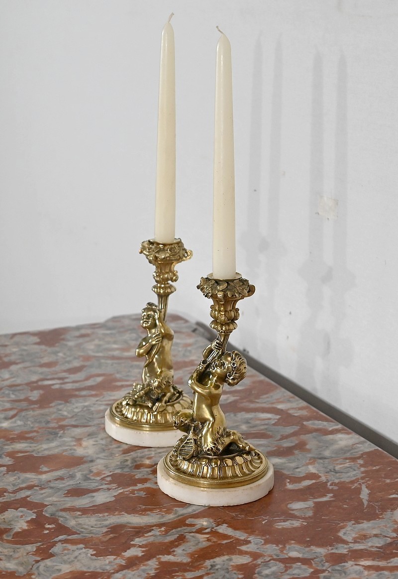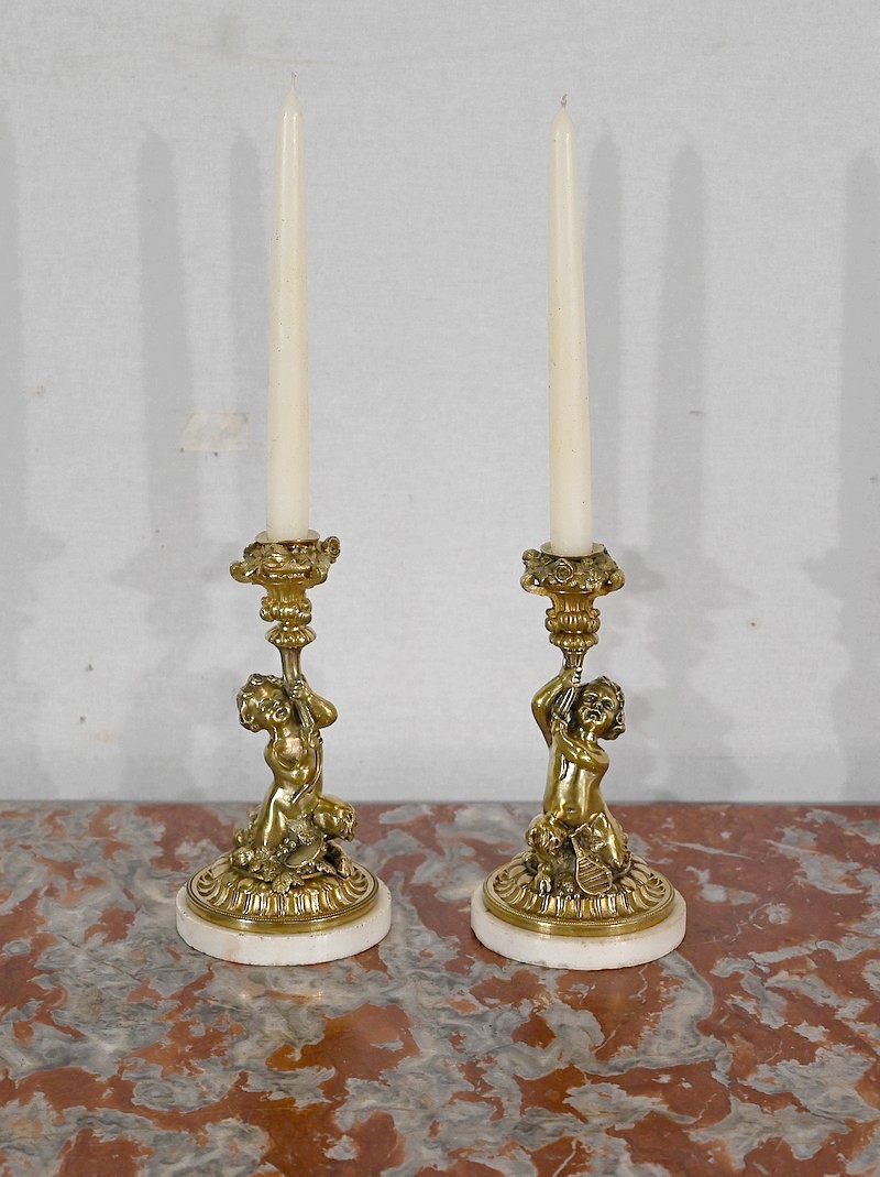 Charmants bougeoirs en bronze figurant des faunes agenouillés tenant une corne d’abondance, reposant sur un socle circulaire en marbre blanc.