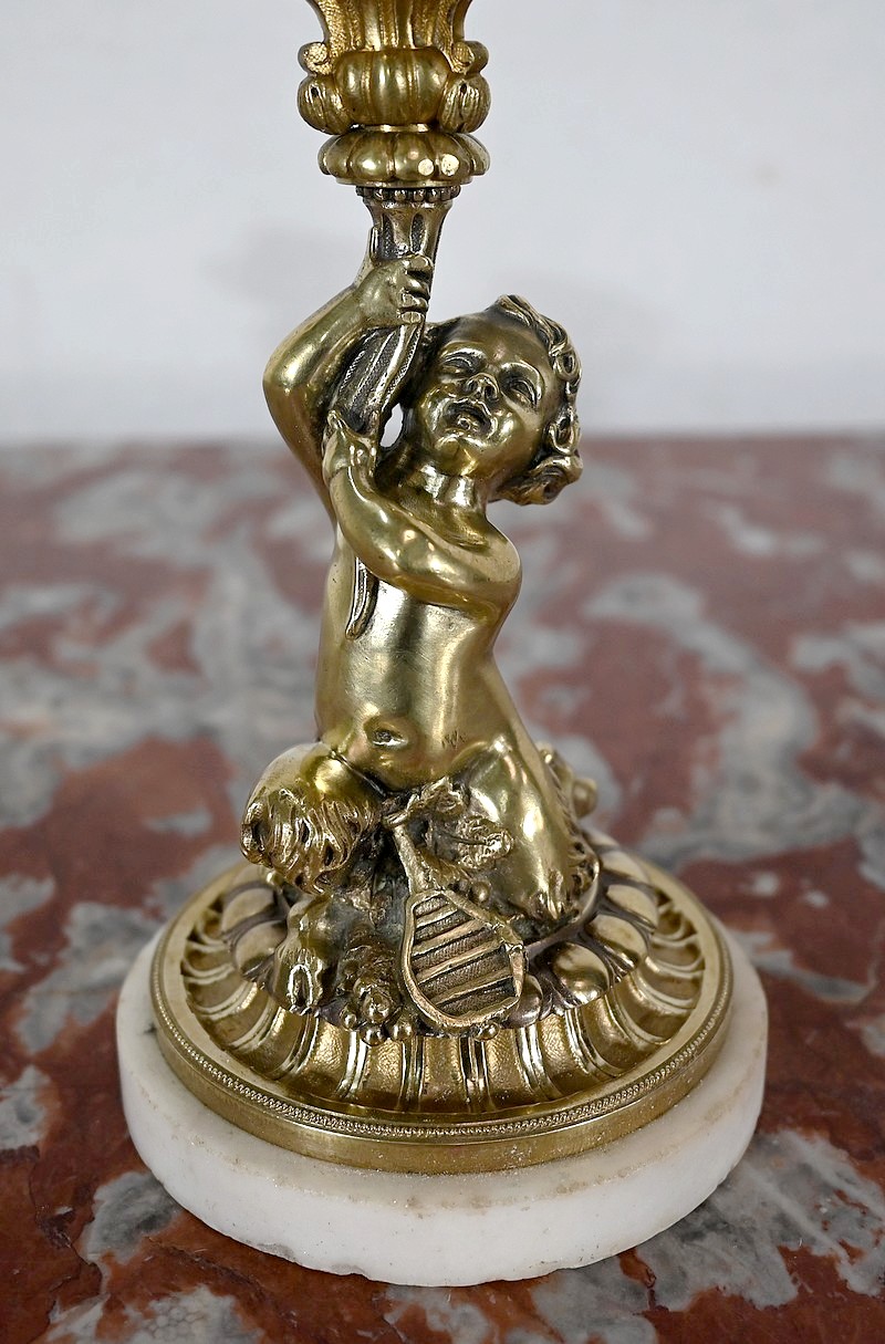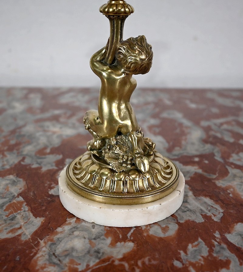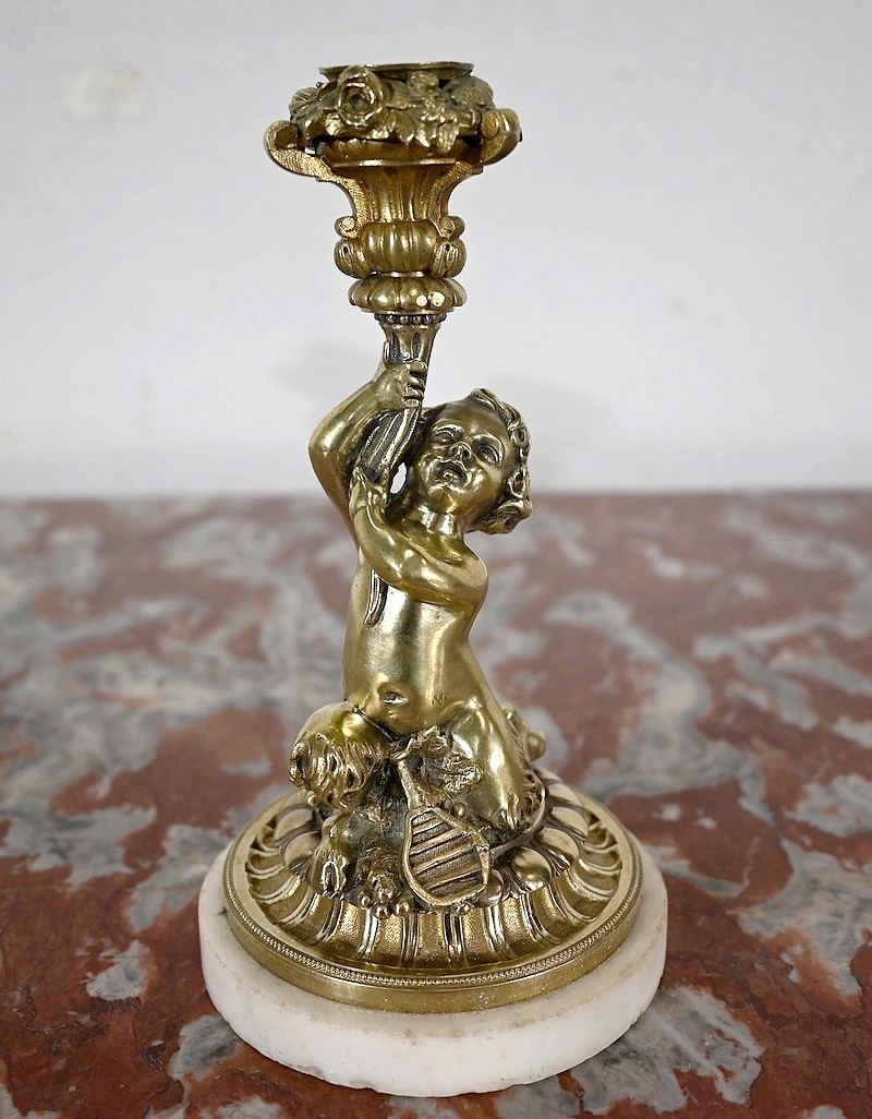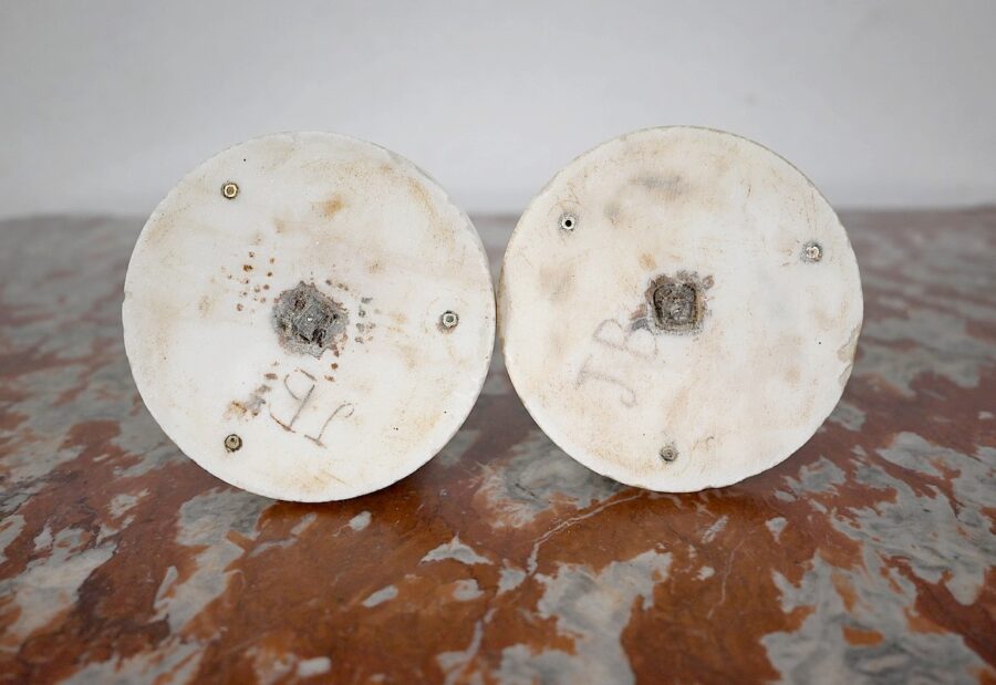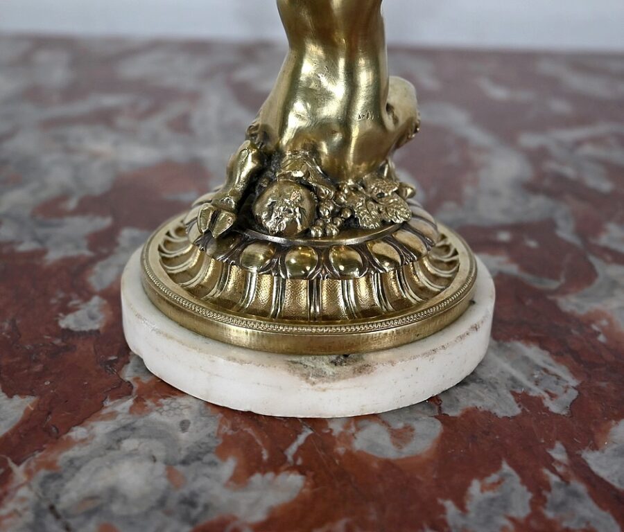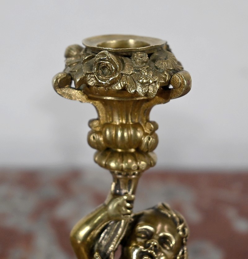 Charmants bougeoirs en bronze figurant des faunes agenouillés tenant une corne d’abondance, reposant sur un socle circulaire en marbre blanc.