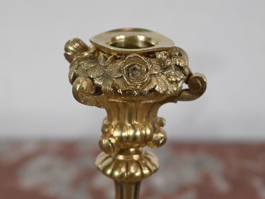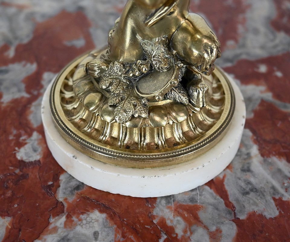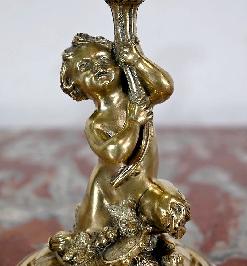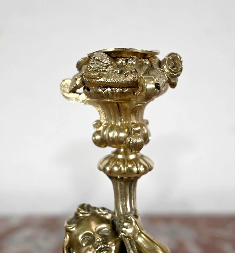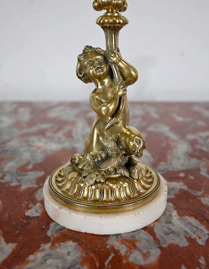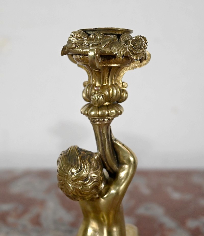 Charmants bougeoirs en bronze figurant des faunes agenouillés tenant une corne d’abondance, reposant sur un socle circulaire en marbre blanc.