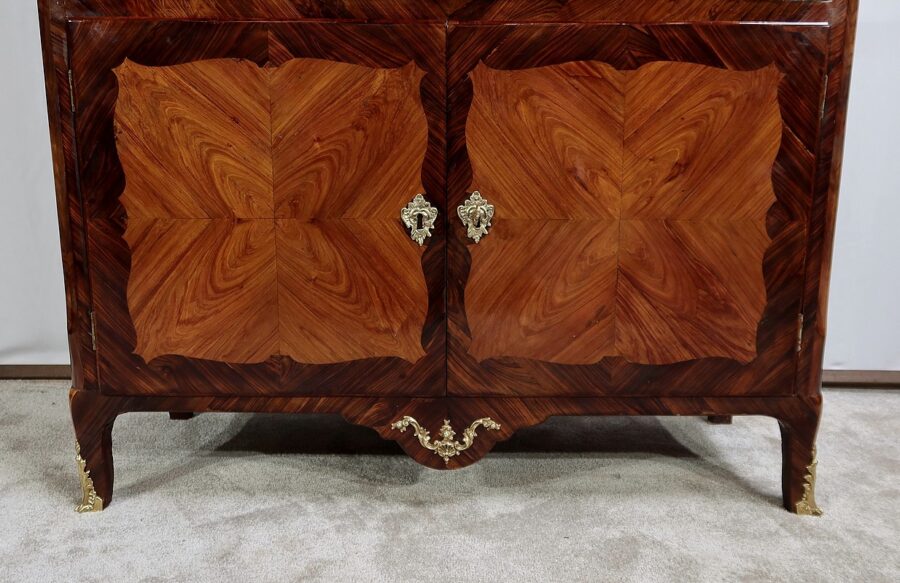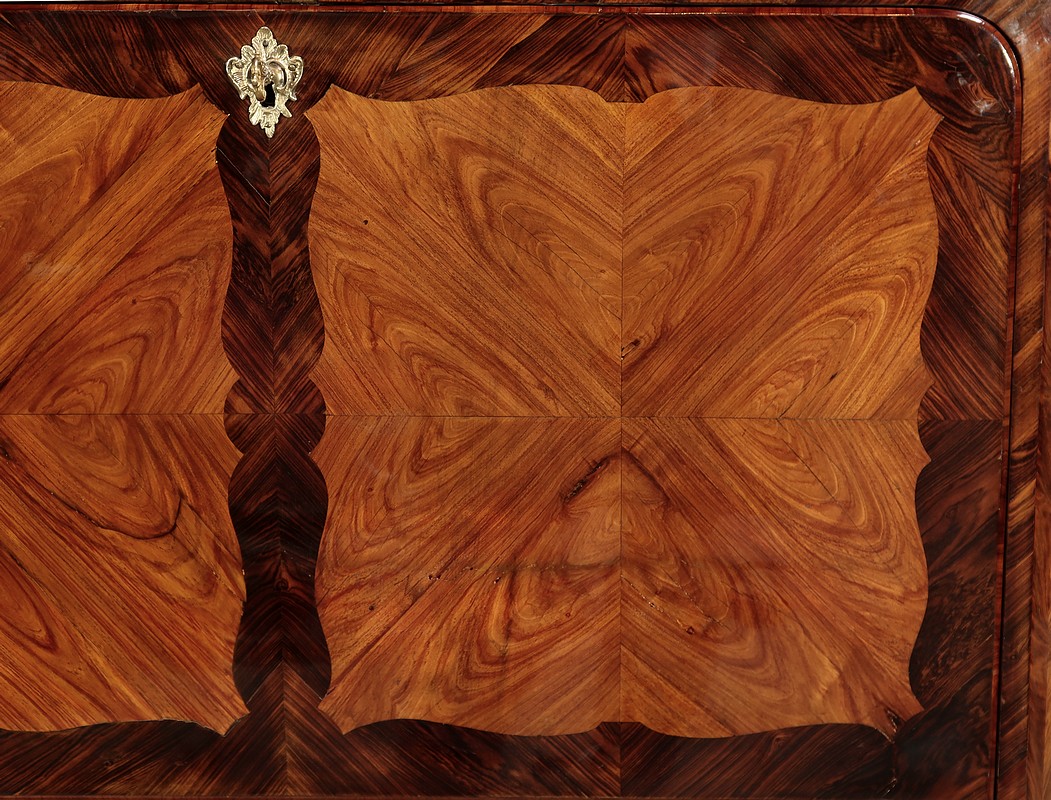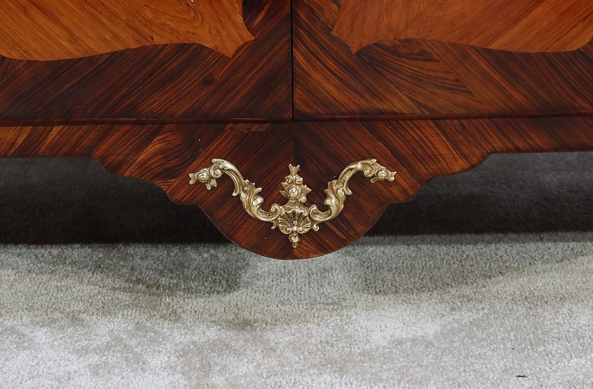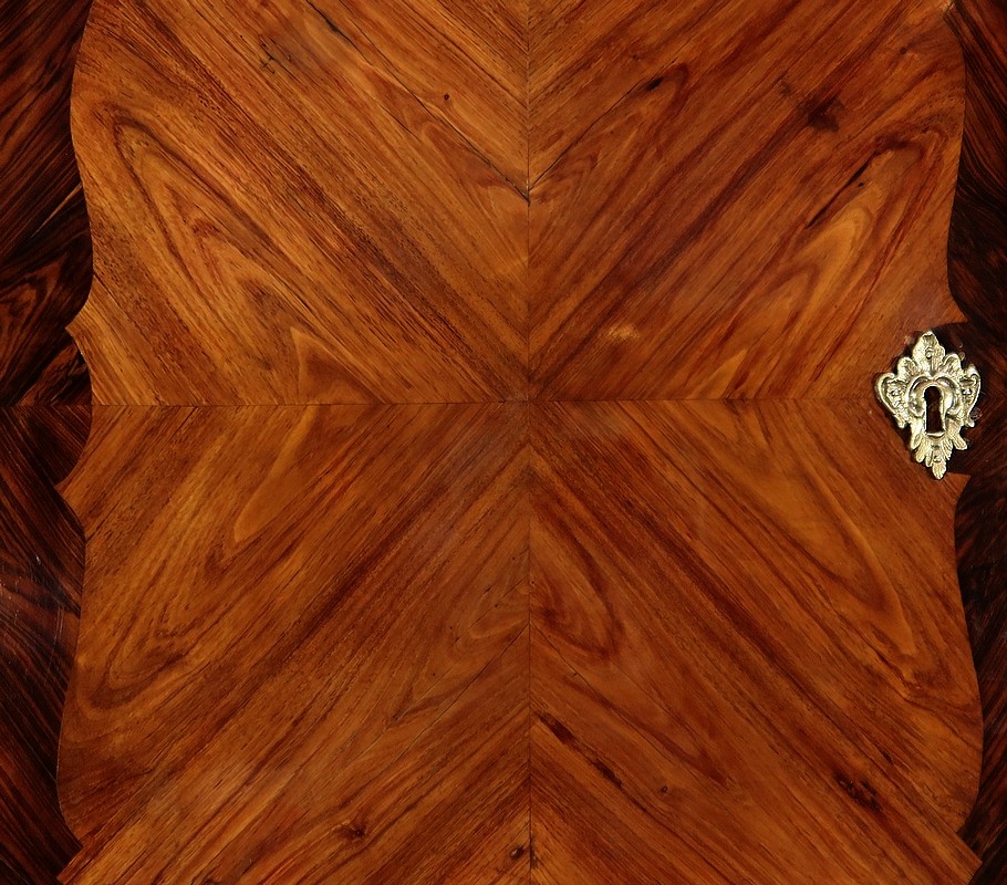 Par ailleurs, ce meuble est doté d’un large abattant dont la façade est plaquée également de deux compositions de feuilles de bois de rose disposées en ailes de papillon et entourées de bois de violette travaillé également de manière mouvementée.