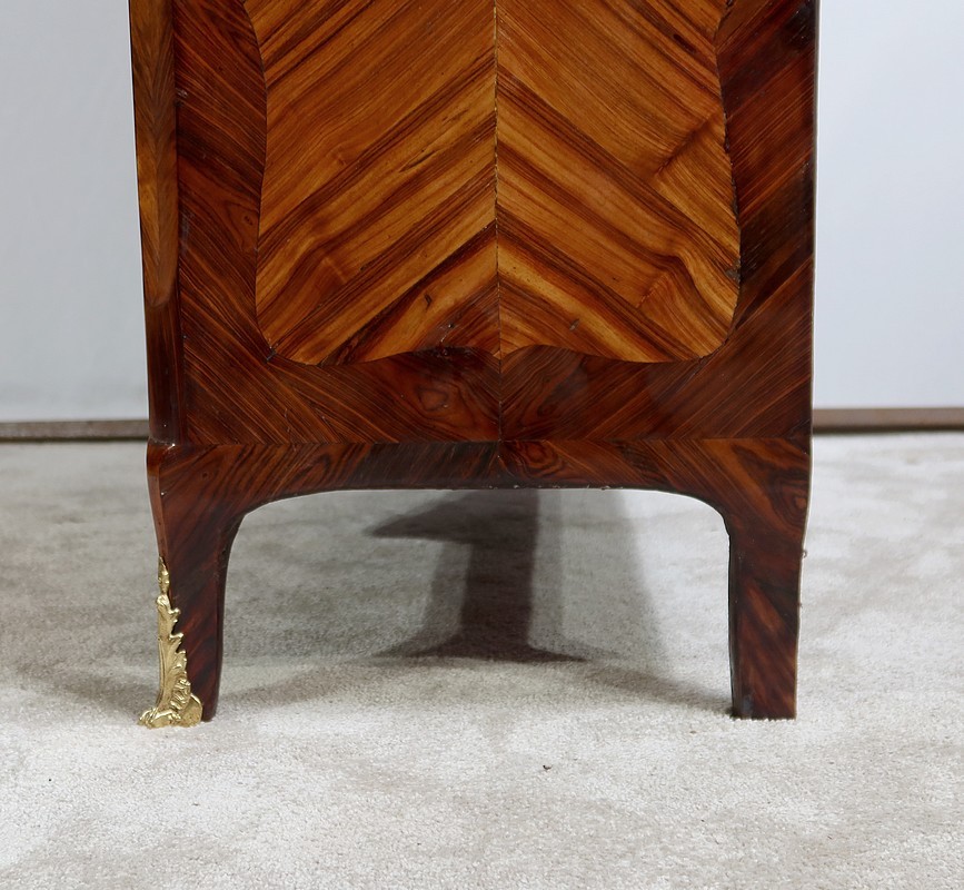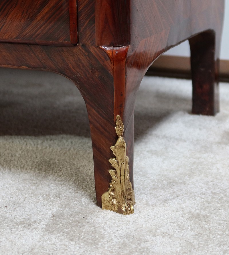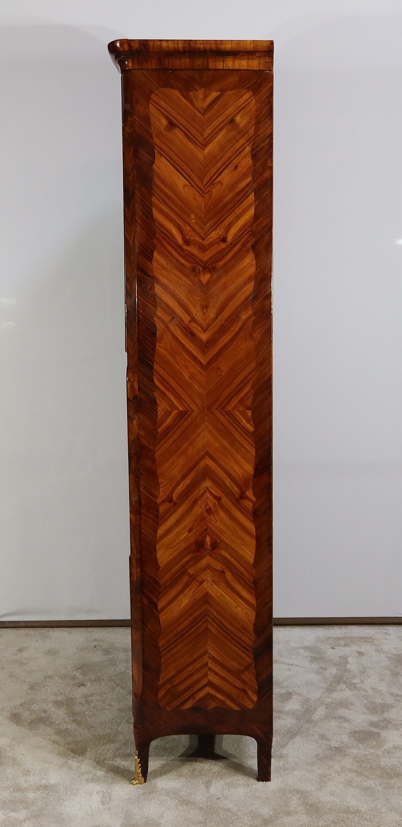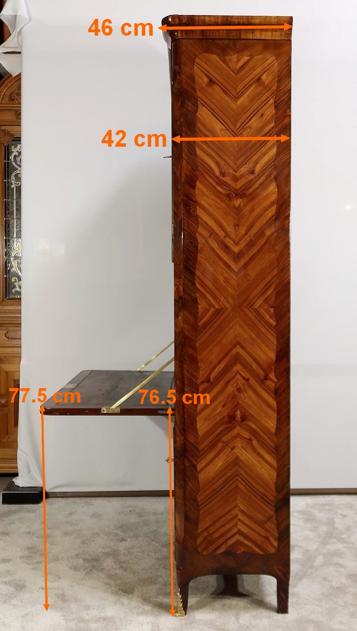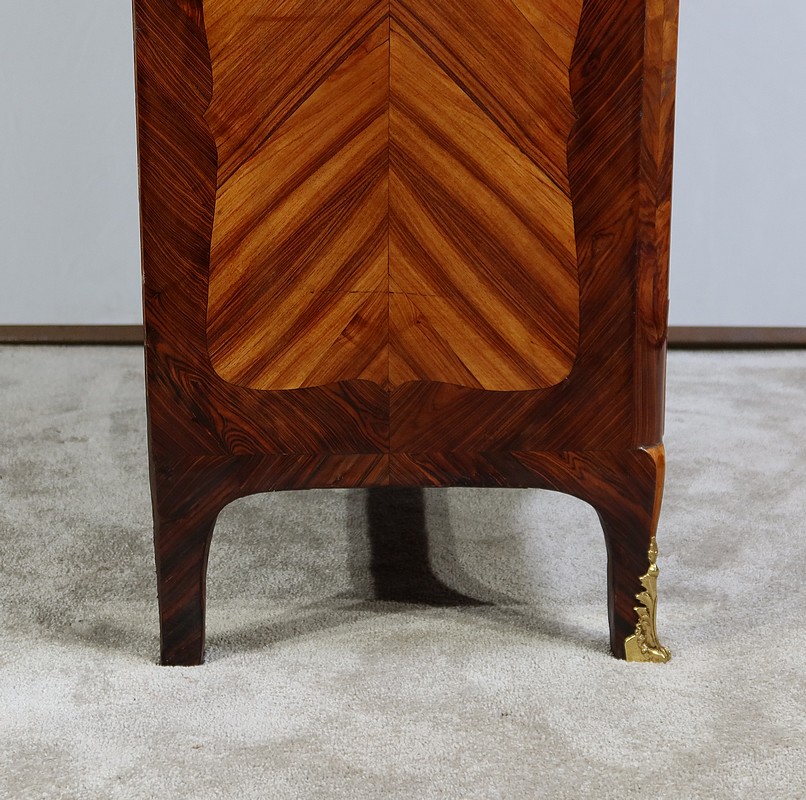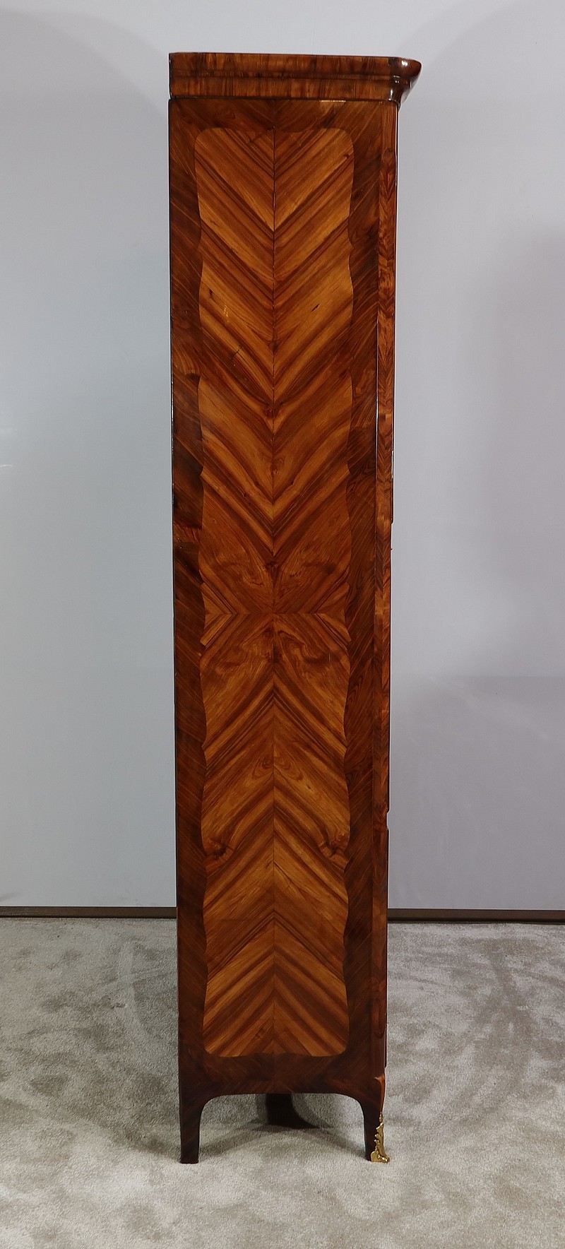 Ce meuble comporte en son sommet une corniche en chapeau de gendarme composée d’une gorge et d’un quart de rond ; avec placage de bois de rose et bois de violette.