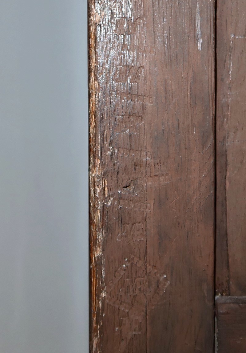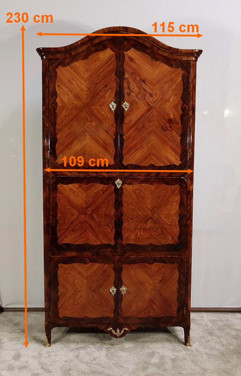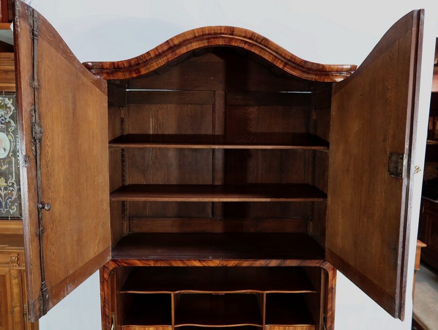 En partie haute, deux grandes portes sont chacune agrémentées d’un placage de bois de rose en ailes de papillon. Autour, une bande découpée par l’intérieur, en bois de violette disposé en diagonale, forme une ligne mouvementée. Ces portes sont équipées d’entrées d’origine en bronze, d’une serrure en parfait état de fonctionnement, bénéficiant sur la porte de gauche d’un système coulissant d’origine et d’une clé postérieure au XVIIIe.