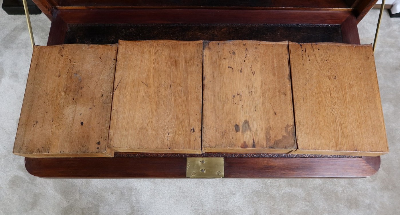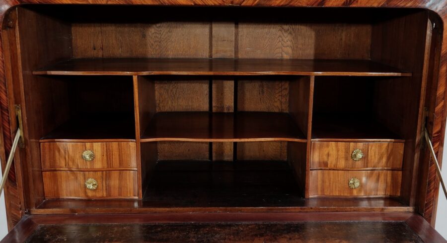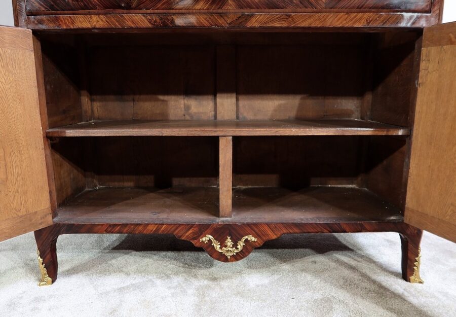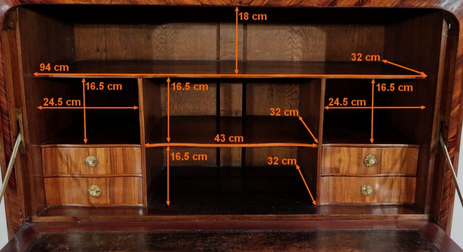 L’intérieur, en chêne, est composé de chaque côté de deux tiroirs dont la façade à mouvement en placage de bois de rose est agrémentée d’un bouton et d’une rosace en bronze d’origine. Nous retrouvons également des niches profondes de différentes tailles.