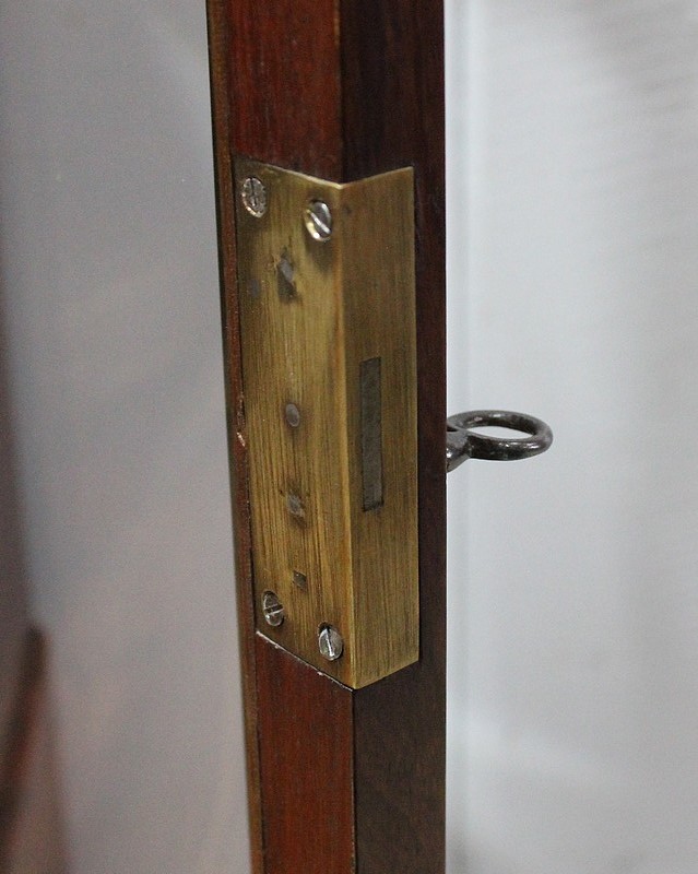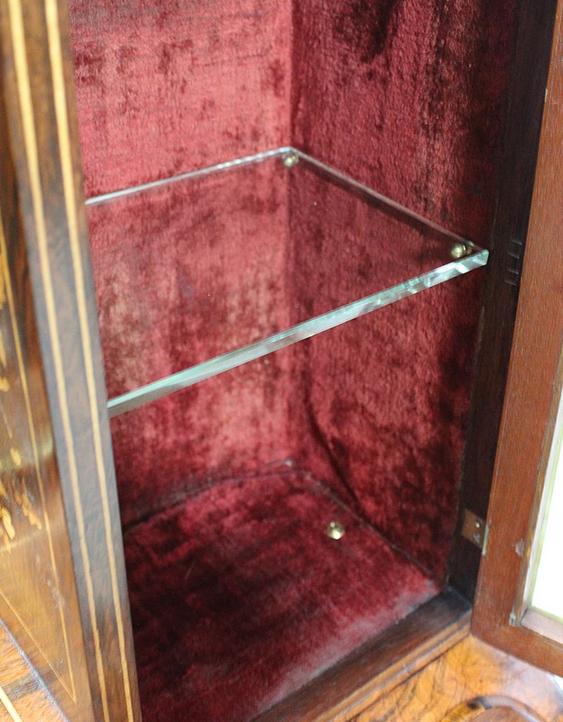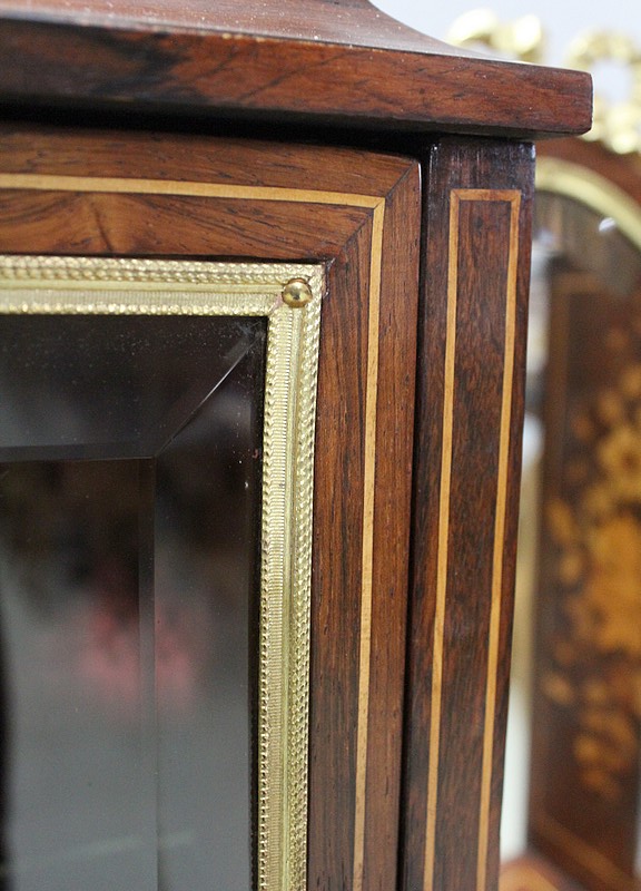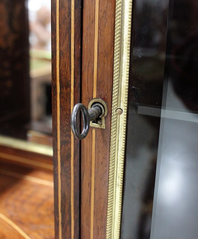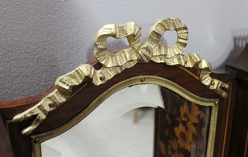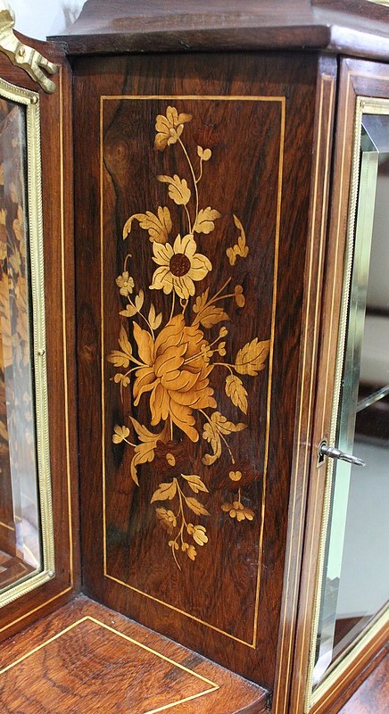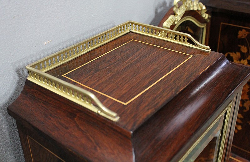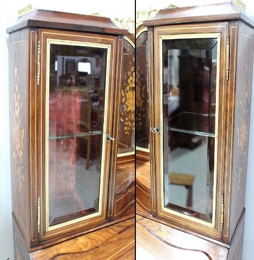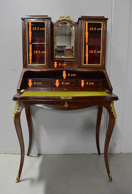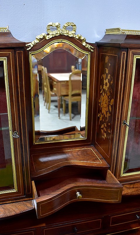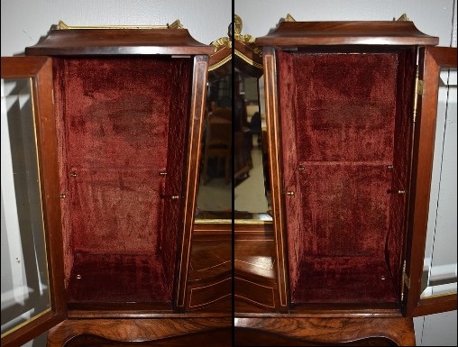 La partie supérieure offre en son centre un petit tiroir à façade concave, sur lequel trône un Miroir, lui même couronné d’un Ruban en Bronze esprit Louis XVI. Sa vitre aux contours biseautés est entourée d’une baguette en laiton ciselé. De part et d’autre, deux petites Vitrines garnies de Velours couleur Amarante et d’étagères en Verre complètent ce Bonheur du Jour. Leurs dessus sont enjolivés de Galeries en laiton ajourées. Les portes, aux ornements similaires à ceux du Miroir, sont dotées de serrures en état de fonctionnement et de leurs clés respectives. On appréciera les Marqueteries de fleurs et de feuillages, en Bois et teintes divers, présentes sur les deux côtés de chacune de ces Vitrines.