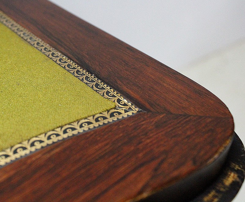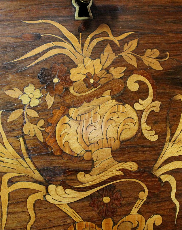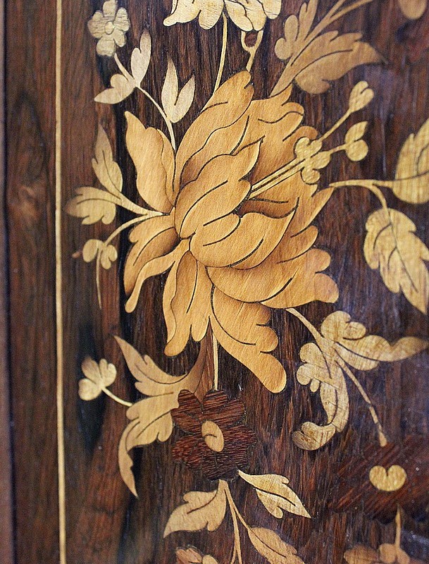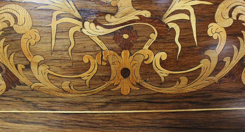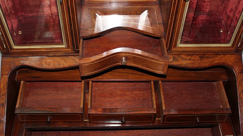 On notera la discrète mais néanmoins omniprésence de filets de Citronnier, formant encadrements autour des Marqueteries, des façades de tiroirs, des portes Vitrées …
