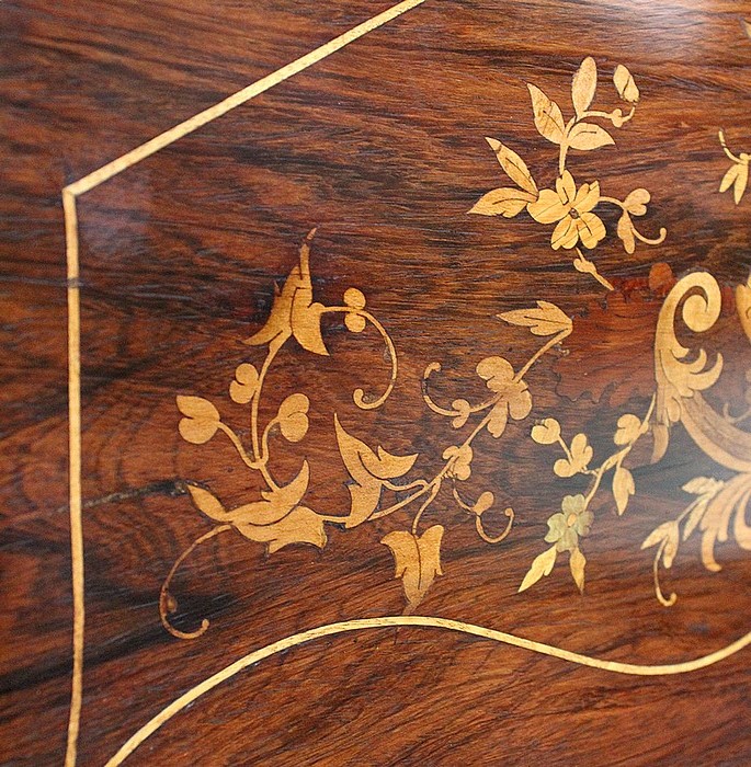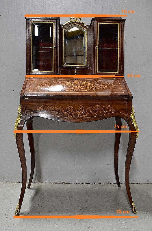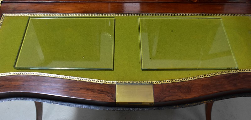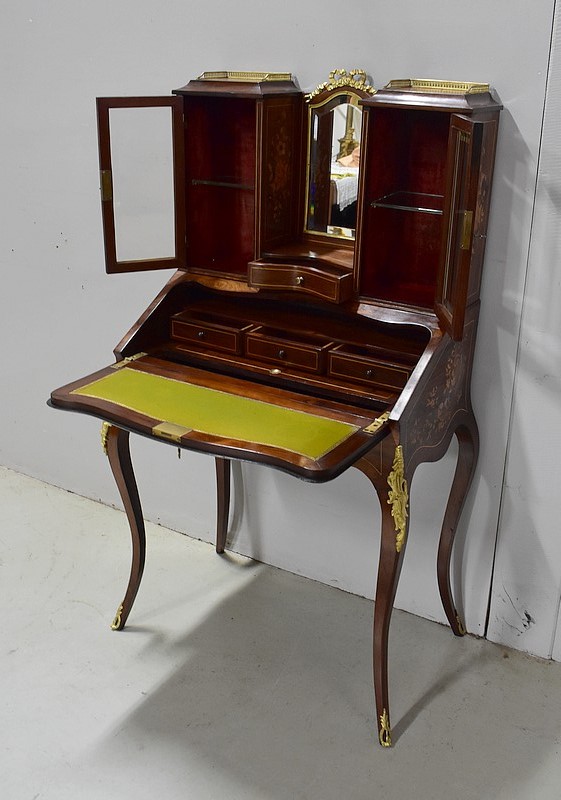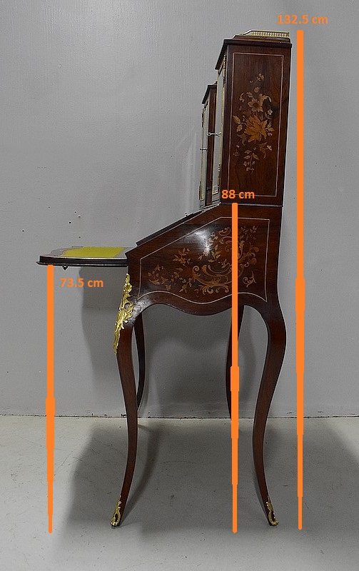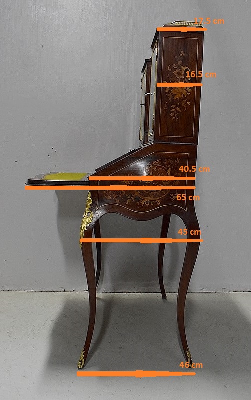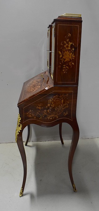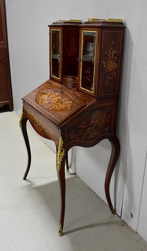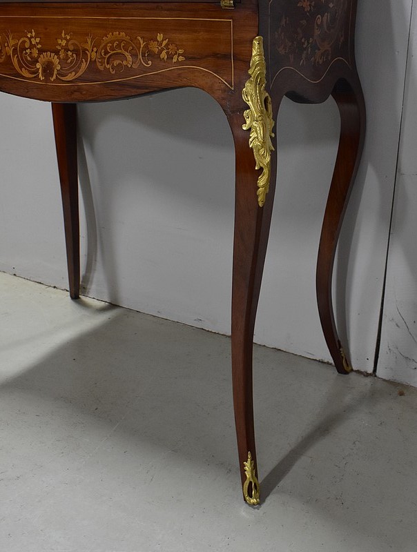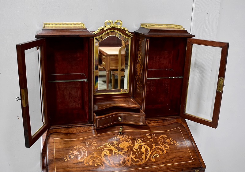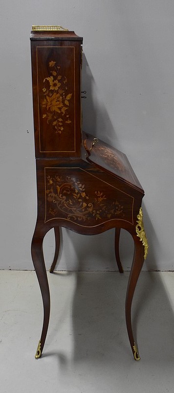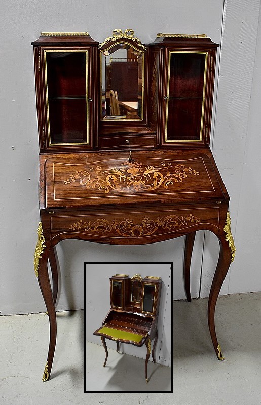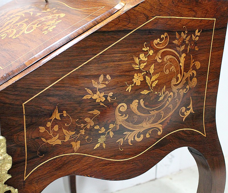 Bonheur du Jour d’époque Napoléon III, avec Marqueteries de Bois divers sur fond de Placage de Palissandre de Rio.