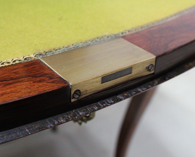 La partie inférieure, au corps bombé dans les deux sens, forme un Petit Secrétaire. Sa ceinture chantournée, ses côtés ventrus et l’abattant incliné par lequel il ouvre arborent de nombreux Décors rappelant ceux décrits précédemment. Une fois déverrouillé, cet espace écritoire révèle une niche en dessous de laquelle s’alignent trois petits tiroirs à boutons de tirage. On y découvre également un compartiment rendu accessible par un dessus coulissant. La zone de travail offerte par l’abattant ainsi déplié est recouverte d’une feutrine de couleur Verte, d’origine, bordée d’une frise Noire et Dorée.
