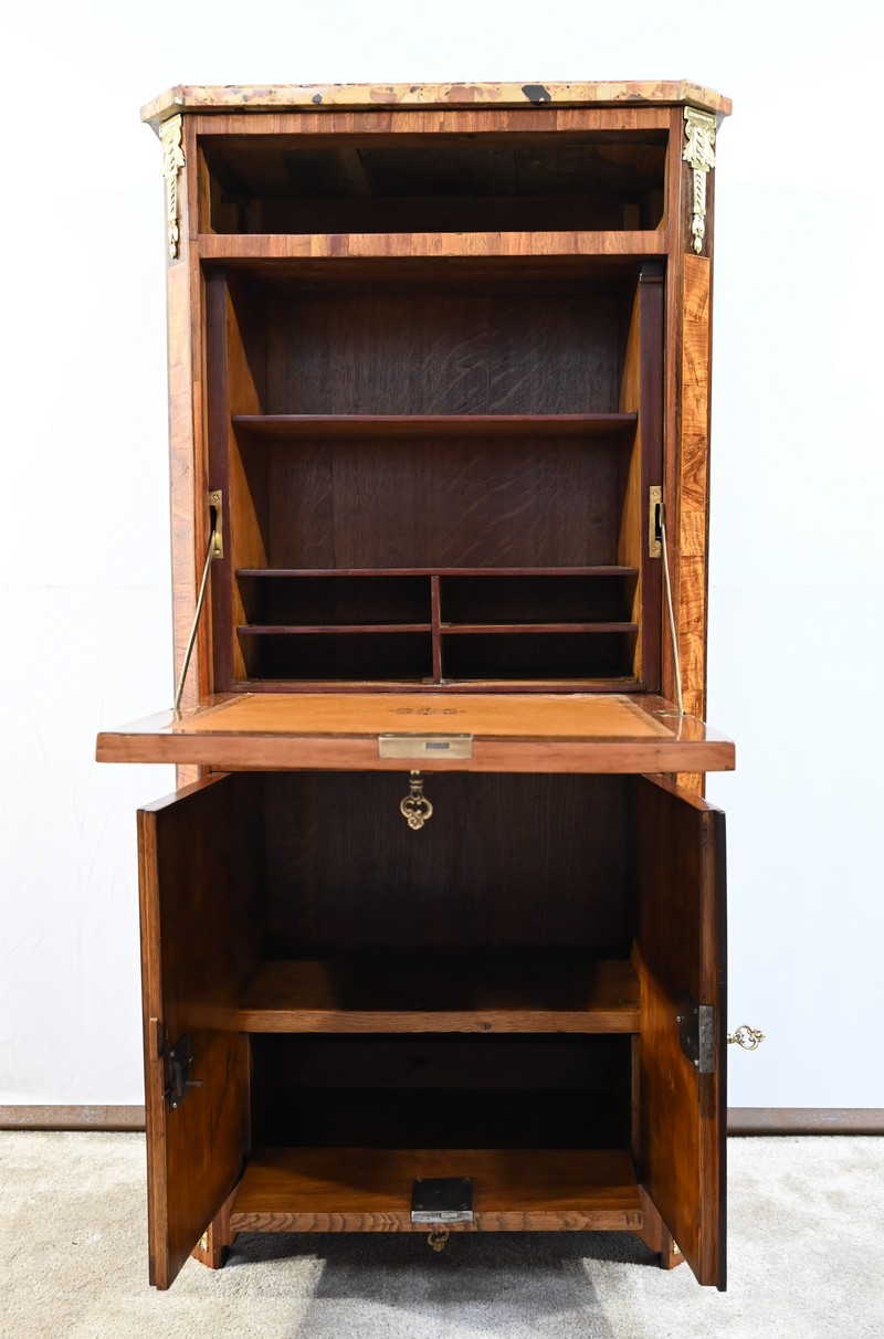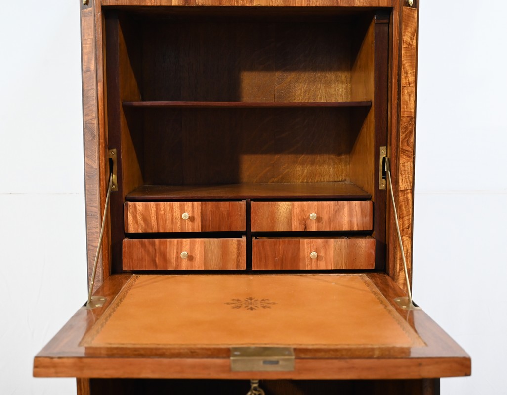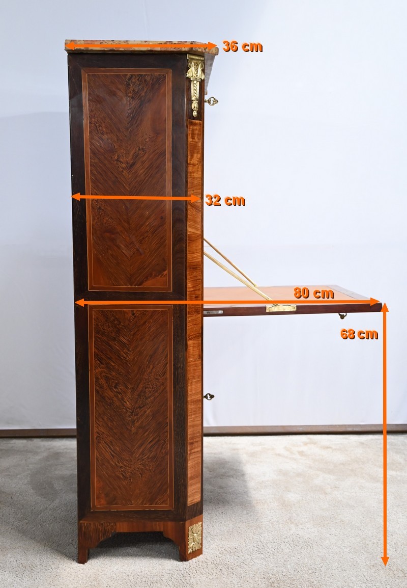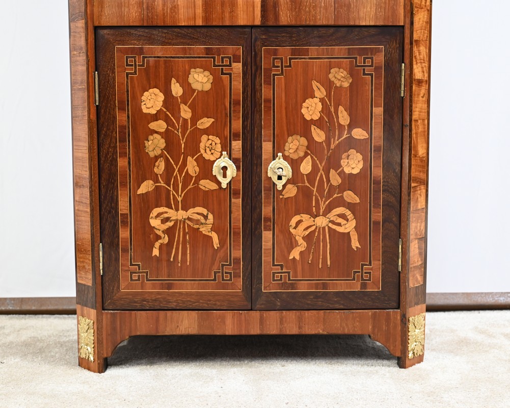 Les montants à pans coupés de ce meuble, en bois de rose et amarante, sont mis en valeur par des chutes « chapiteau » en haut et des motifs en bronze doré en bas.