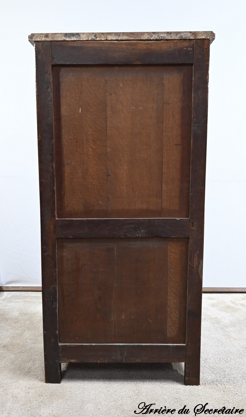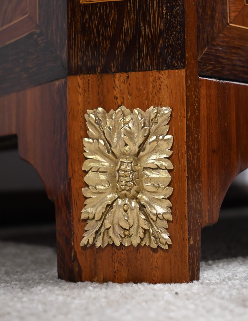 En dessous, l’abattant, également muni d’une serrure d’origine, présente un important décor en marqueterie d’une corbeille de fleurs avec pourtour et coins grecques en amarante.