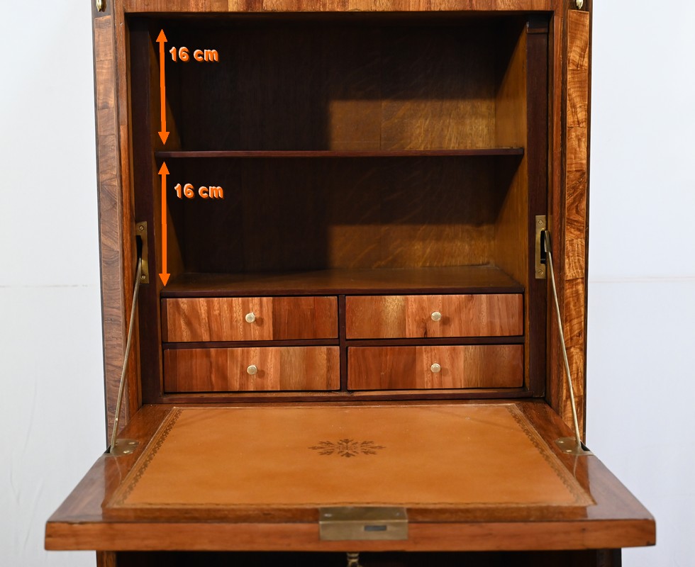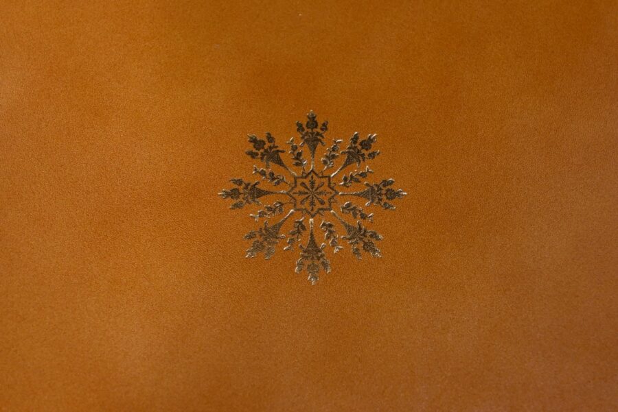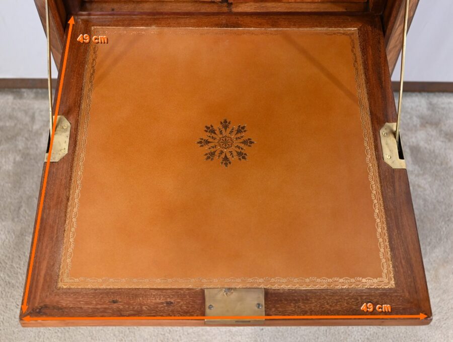 Ouvert, cet abattant, garnis d’un cuir orange refait avec vignette dorée et motif central, est maintenu par deux compas laiton.