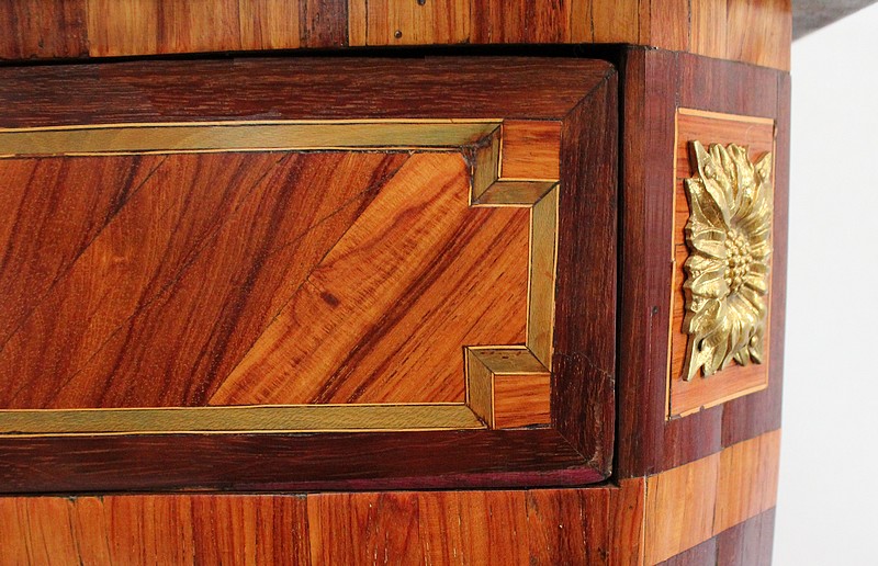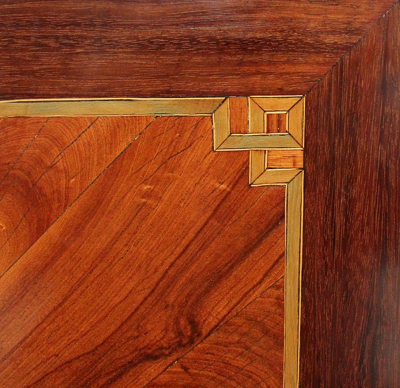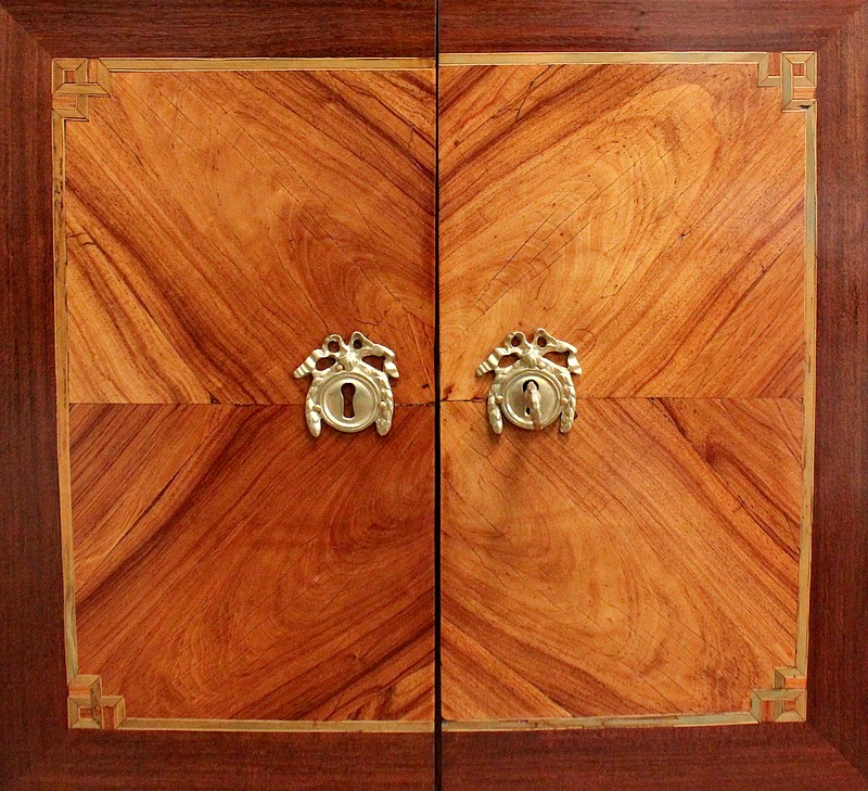 Les côtés à pans coupés et les flans bénéficient également de panneaux de marqueterie en bois précieux. Ils sont agrémentés de médaillons de bronze délicatement ciselé en partie haute et basse.
