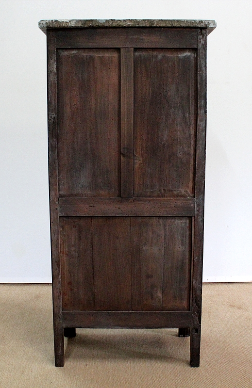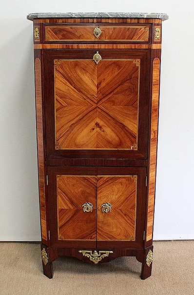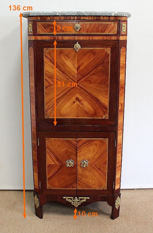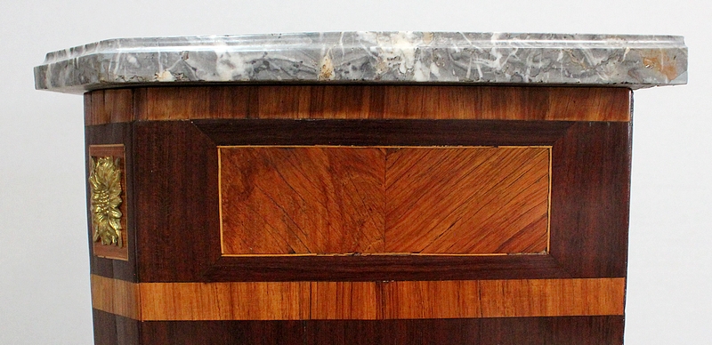 Raffiné, ce meuble en marqueterie est sommé d’un marbre des Pyrénées alliant nuances de gris et de blanc. D’une large épaisseur, ce marbre est muni d’une gorge en son pourtour et de pans coupés à l’avant.