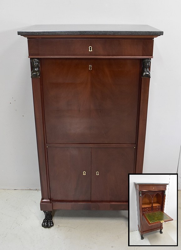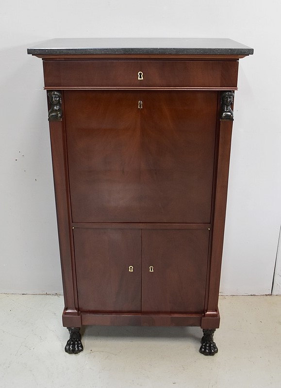 Petit Secrétaire en Placage d’Acajou avec dessus en Marbre Gris foncé.