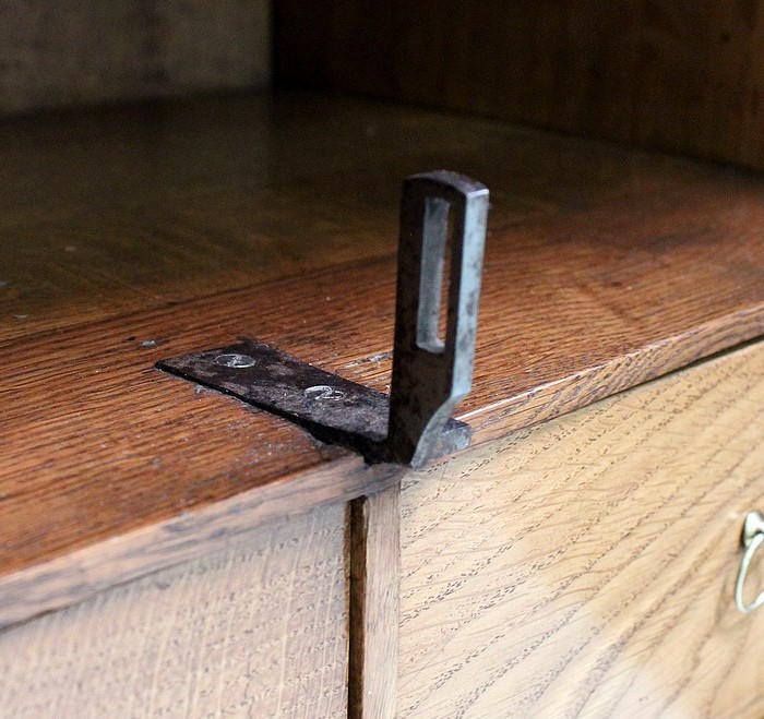 En partie basse, ce Secrétaire est pourvu de deux portes, à fermeture en Noix, évitant ainsi toutes déformations. Elles abritent quatre autres tiroirs, disposés sur deux rangs, composés de Chêne Clair et assemblés en Queues d’Arondes.