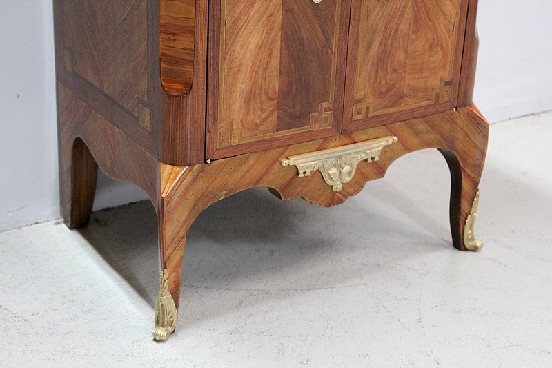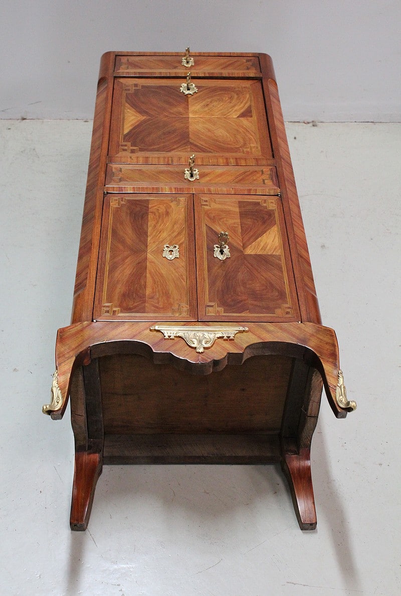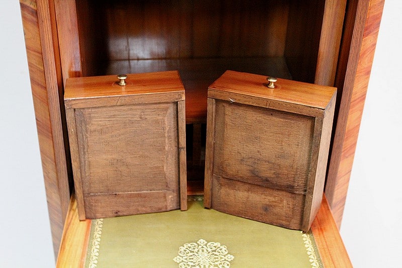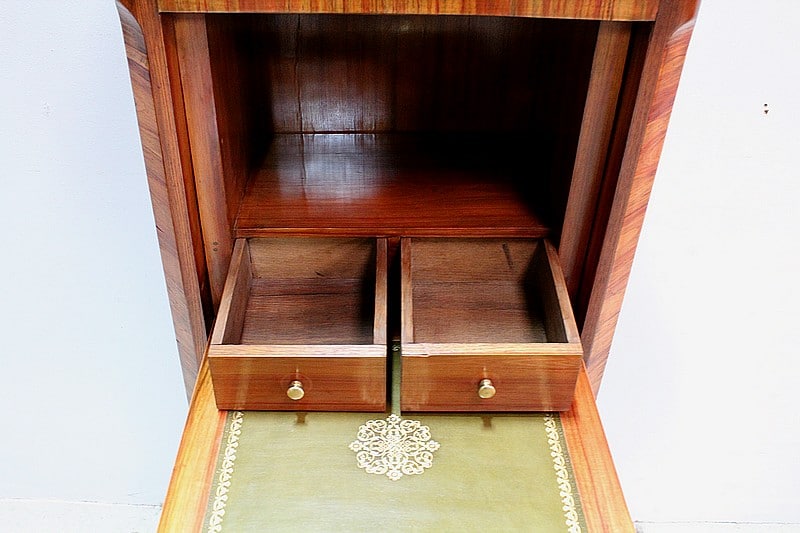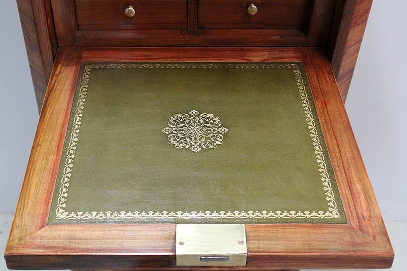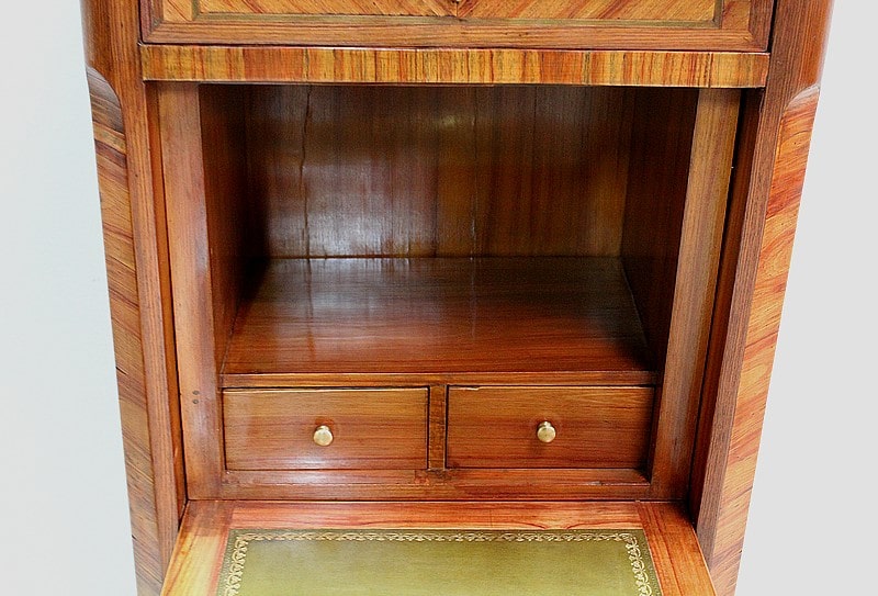 Également, il ouvre par un abattant marqueté en ailes de papillon en partie haute, lequel donnant sur un tabernacle composé d’une grande niche et de deux petits tiroirs à boutons. L’intérieur de l’abattant est quant à lui, recouvert d’un cuir vert refait orné d’un motif central et d’une frise dorés.