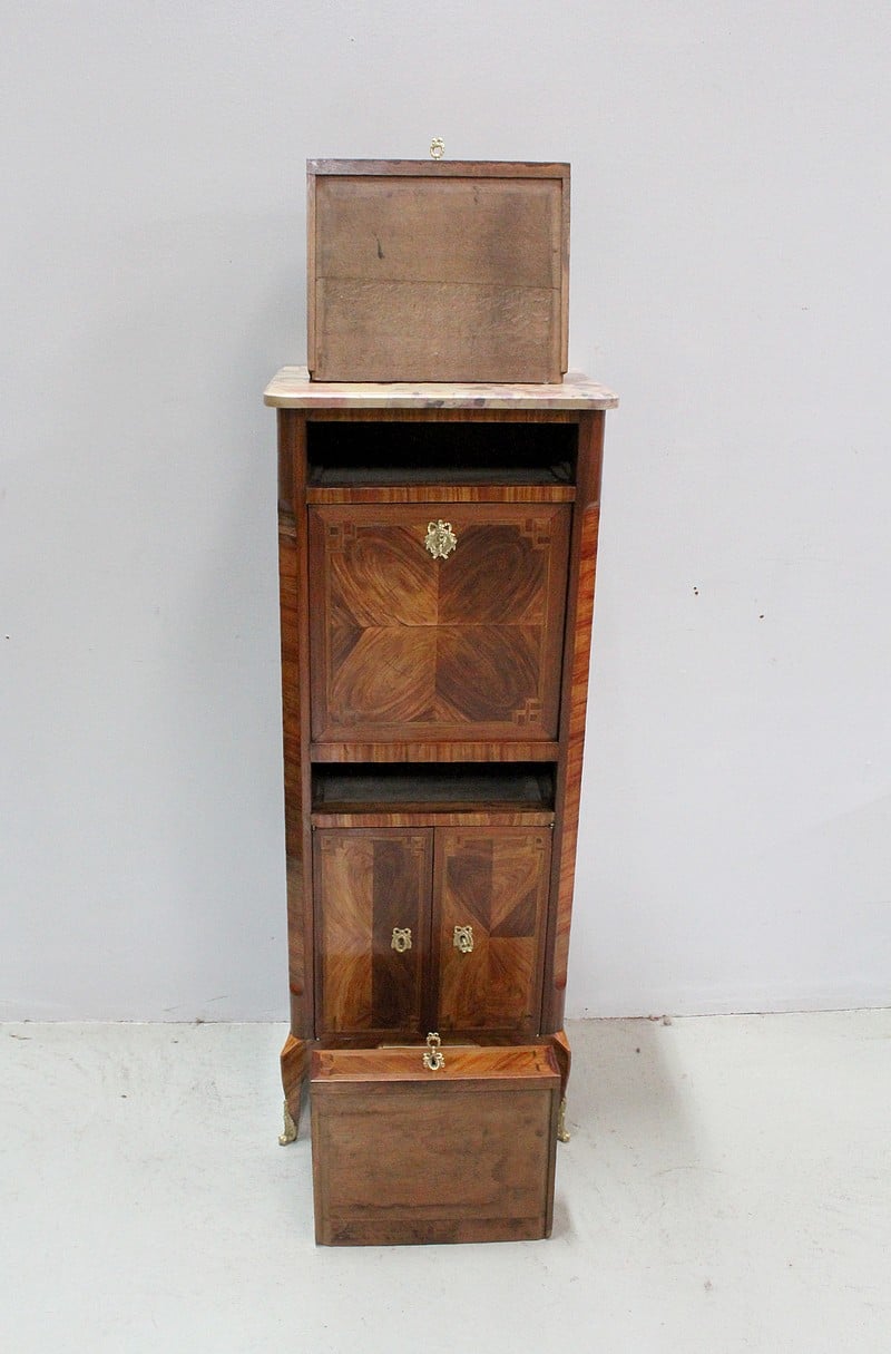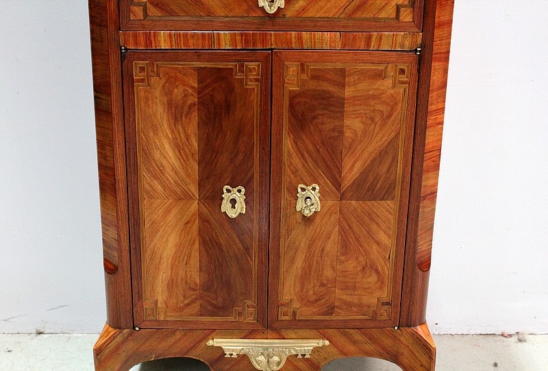 Enfin, en partie basse, il ouvre par deux petites portes marquetées en ailes de papillon fermant à clef et par un crochet intérieur, donnant sur un intérieur composé d’une étagère posée sur tasseaux fixes.