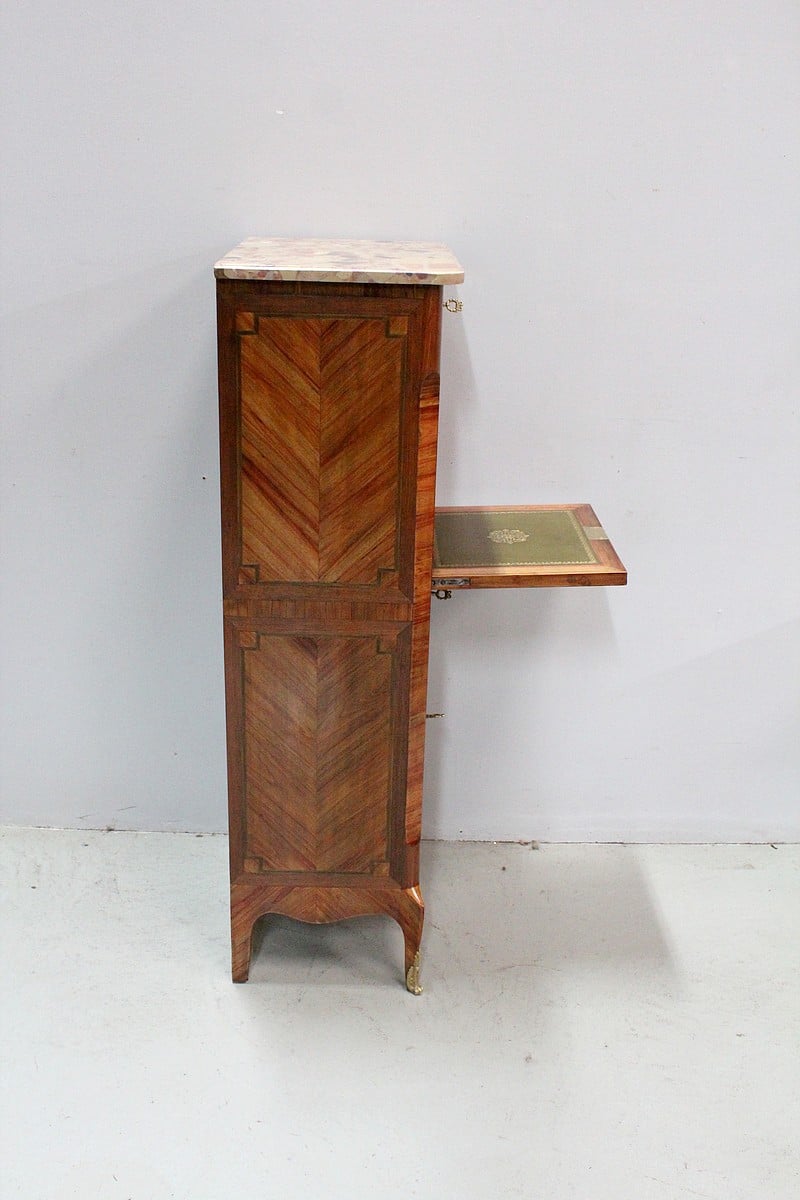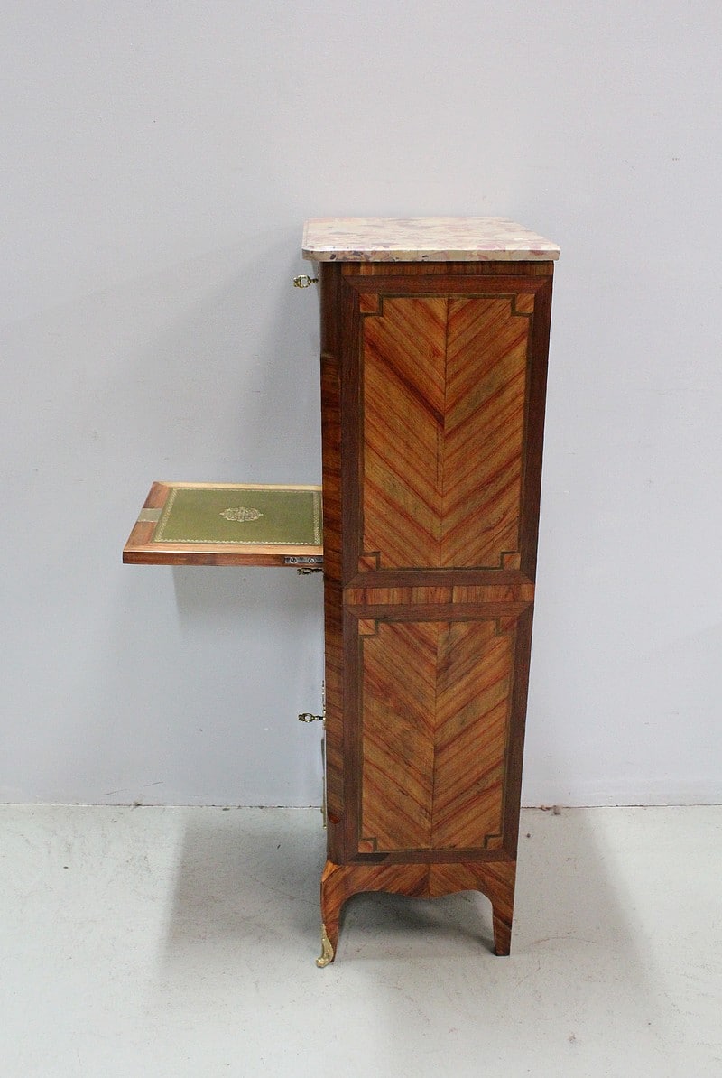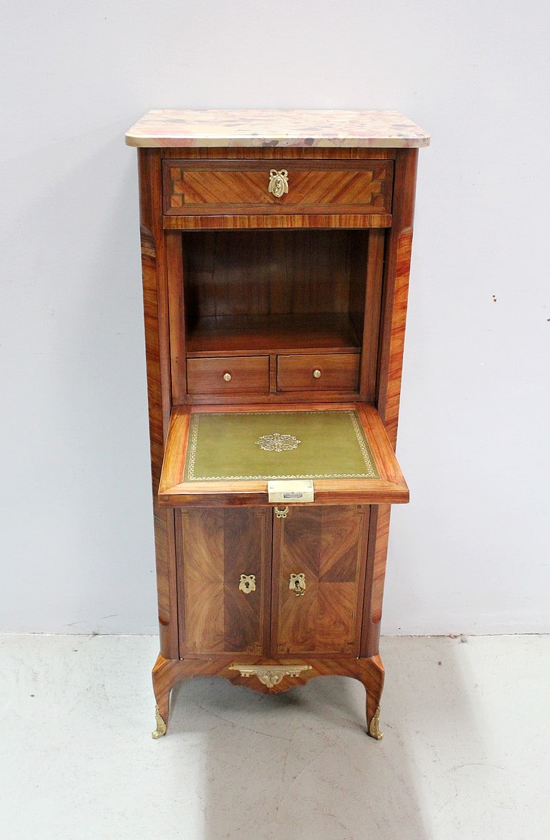Petit secrétaire Transition Louis XV – Louis XVI en marquèterie de Bois de Rose et d’Amarante.