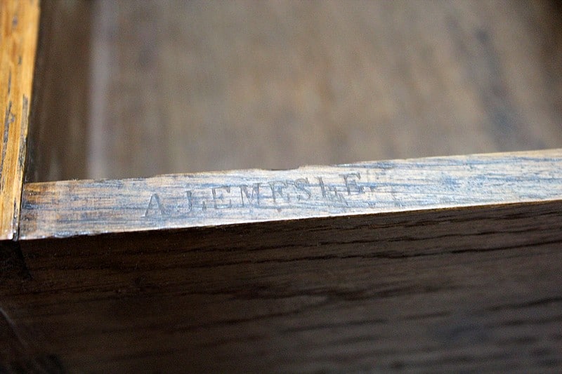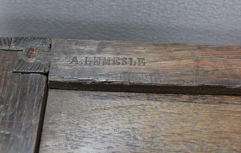 Il ouvre par un tiroir en ceinture et un autre à mi-hauteur, tous deux fermant à clef et marqués sur la tranche ‘A. LEMESLE’.