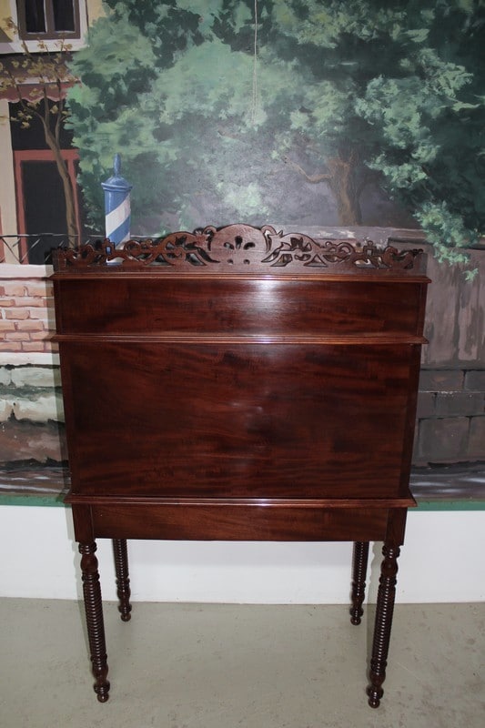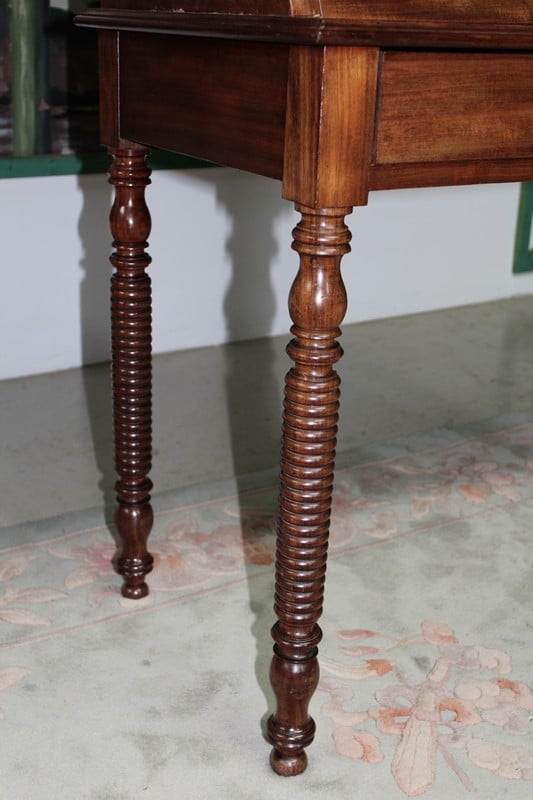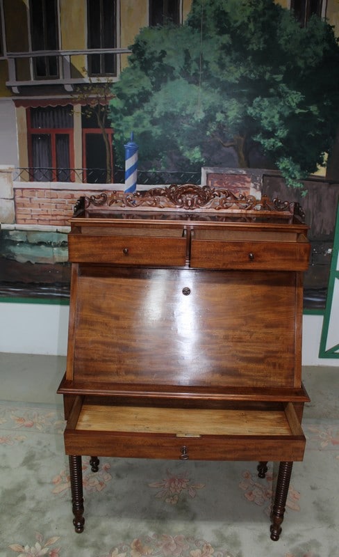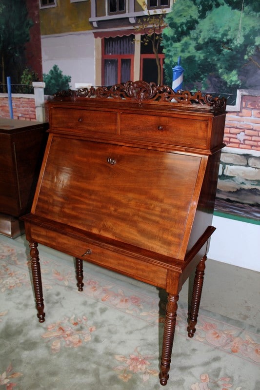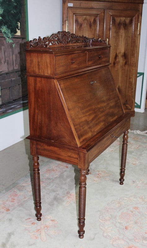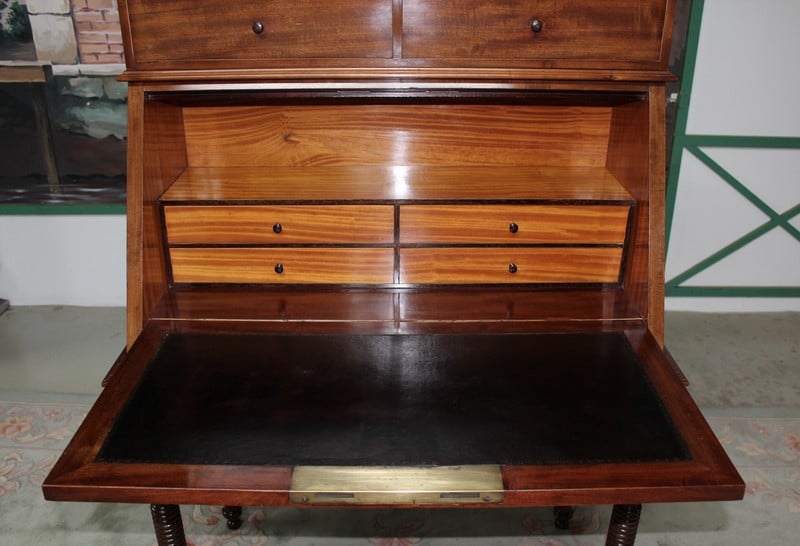 Petit Secrétaire de pente en placage d’acajou avec champs et boutons en palissandre sur ossature et tiroirs en chêne, reposant sur 4 pieds tournés. Il ouvre par 2 petits tiroirs en partie haute, un abattant et un grand tiroir dans la ceinture. L’intérieur, garni de 4 tiroirs et une niche, est en citronnier , l’abattant est recouvert de son cuir noir d’origine.