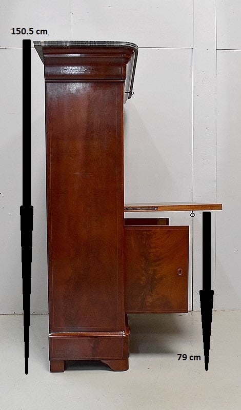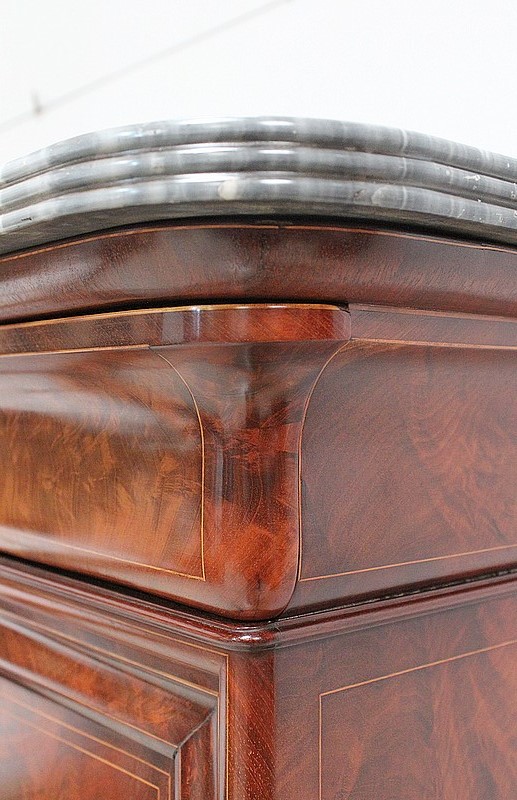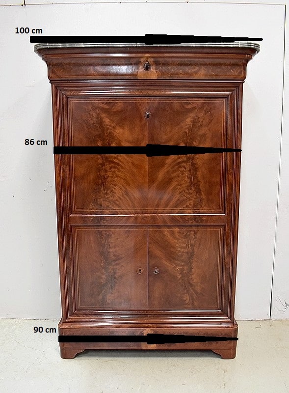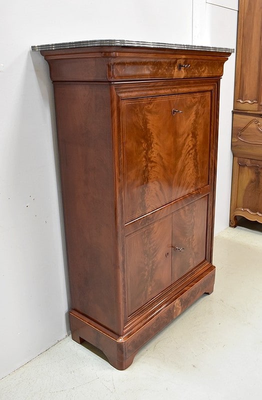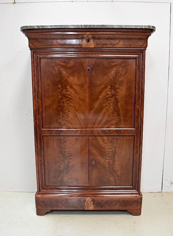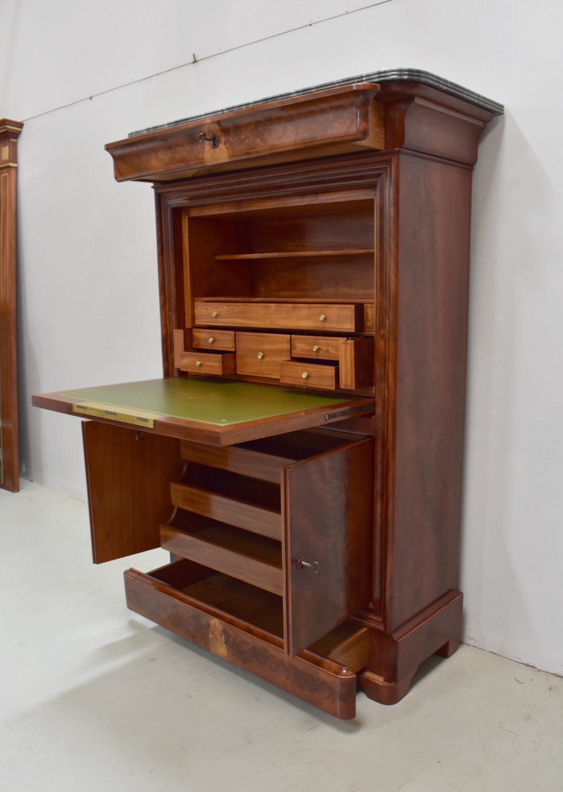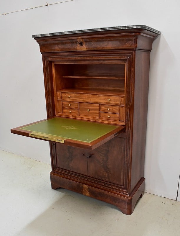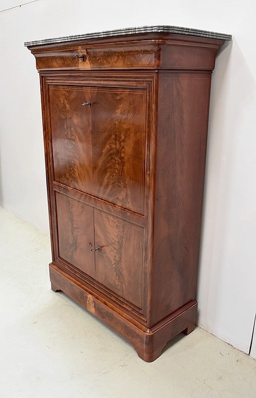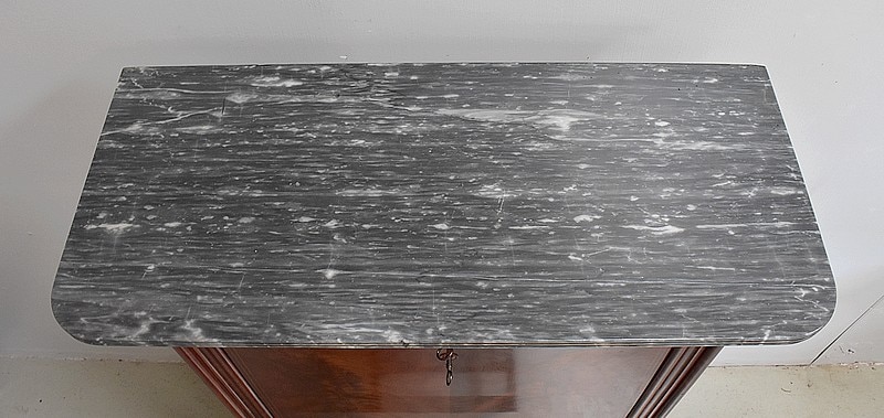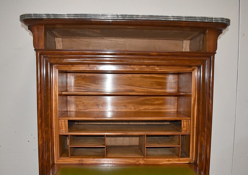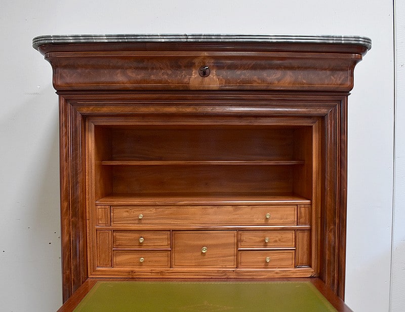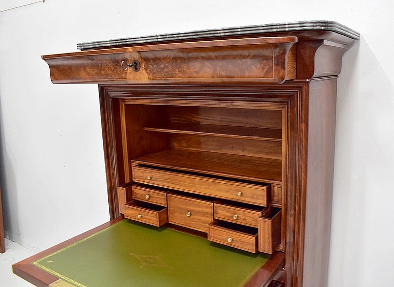 Très beau Secrétaire en Placage de Ronce d’Acajou avec dessus en Marbre Bleu Turquin taillé en Triple Baguettes.