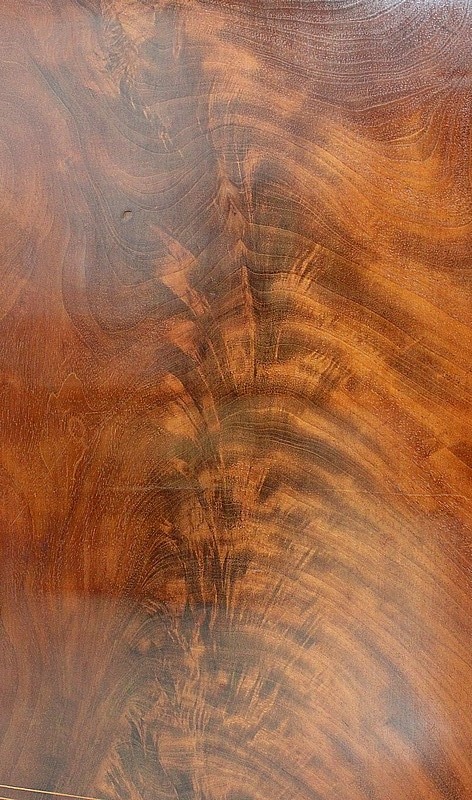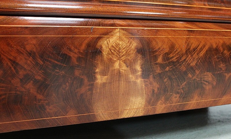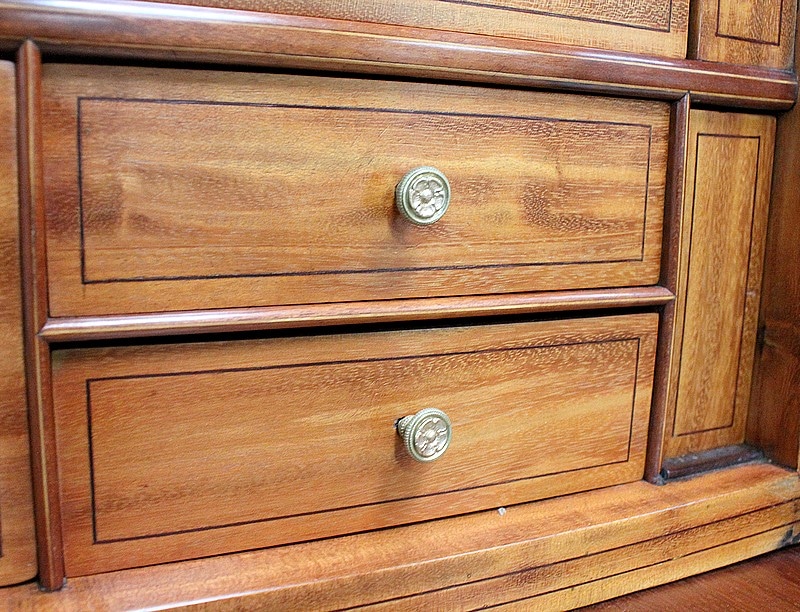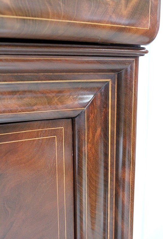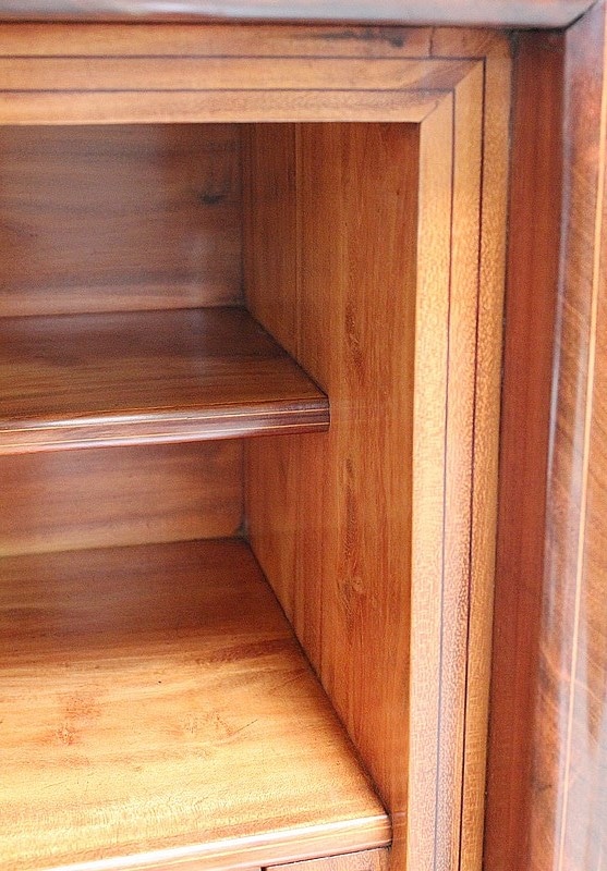 On appréciera aussi les moulures à Doucine encadrant la partie centrale du meuble, ainsi que les discrets mais omniprésents filets de citronnier, visibles sur les chants des étagères, la face apparente des pieds, les côtés …