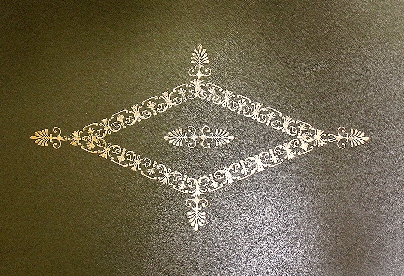 L’ abattant est recouvert d’un cuir de couleur Verte, ornementé d’une Vignette centrale, de Fleurons d’Angles et, en bordure, de Frises, tantôt Dorée, tantôt sur fond dur.