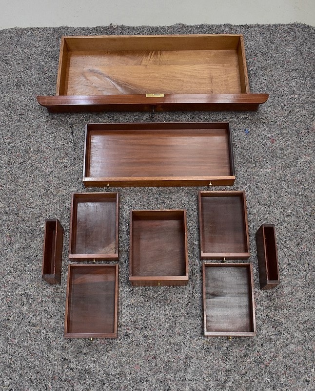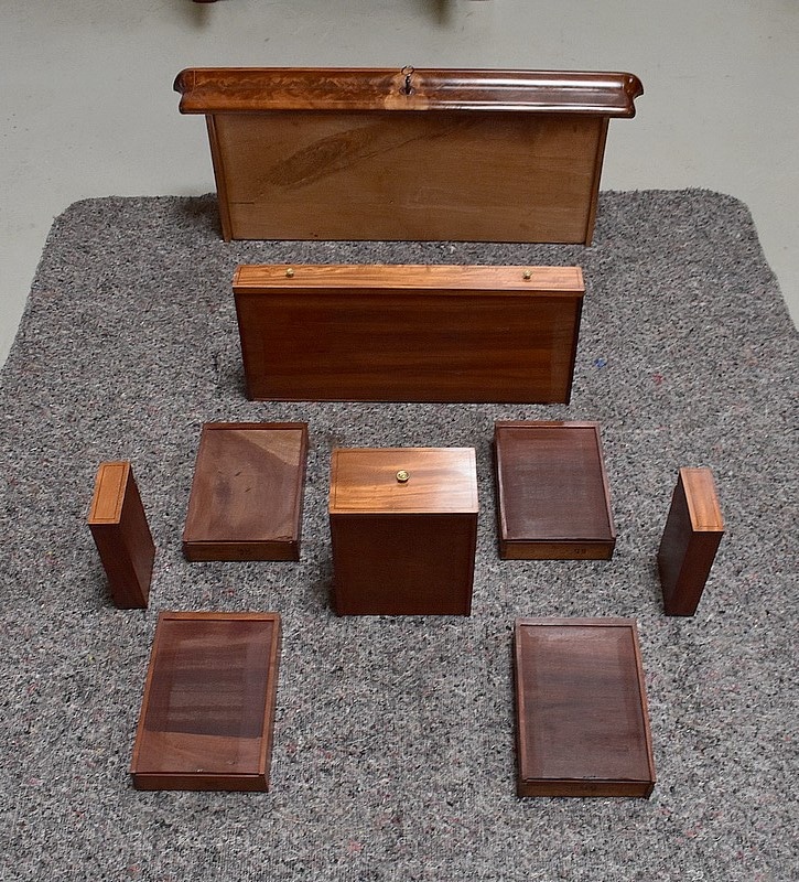 En dessous, il se compose d’un abattant découvrant un espace – constitué pour l’essentiel de Citronnier – doté de deux étagères et de huit petits tiroirs de capacités différentes. Deux d’entre eux sont Secrets, les autres ouvrent par de petits boutons de tirage en laiton sculptés finement en Fleurs. Tous sont agrémentés de filets d’Amarante formant encadrements. Détail suffisamment rare pour être souligné, l’intérieur de ces tiroirs est en Acajou.