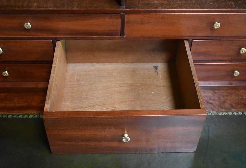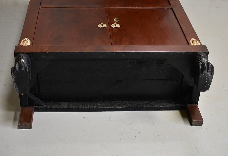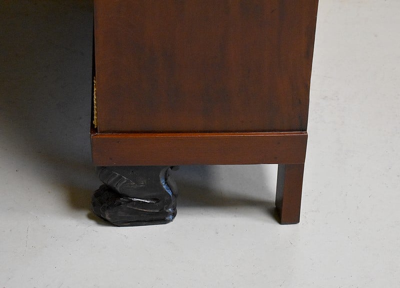 Les intérieurs, l’arrière et les fonds de tiroirs sont en Chêne. L’arrière est panneauté et le meuble repose sur 2 pieds griffes à l’avant et 2 pieds droits à l’arrière.
