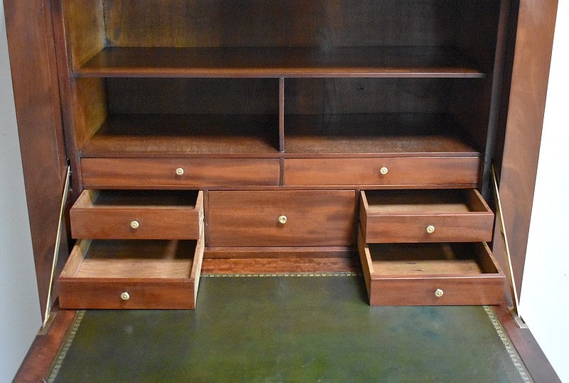 Il ouvre par un grand tiroir en partie haute fermant à clef. En dessous, il ouvre par un abattant découvrant à l’intérieur un tabernacle composé de 3 casiers en haut et 7 tiroirs à boutons en dessous.
