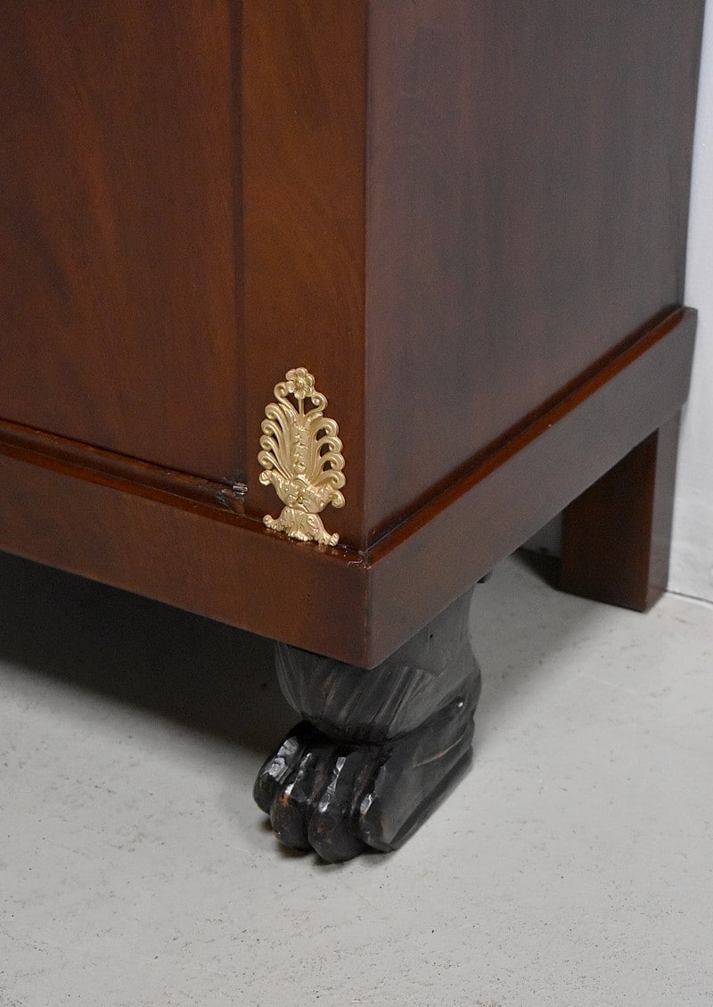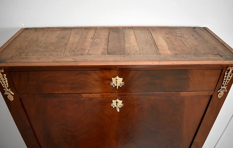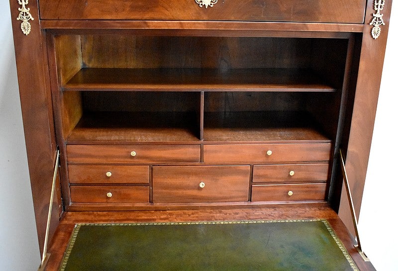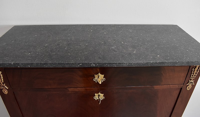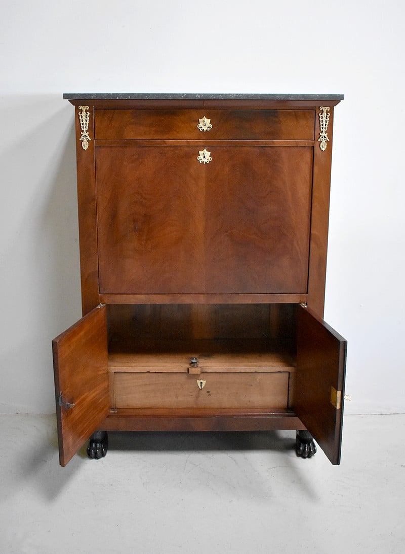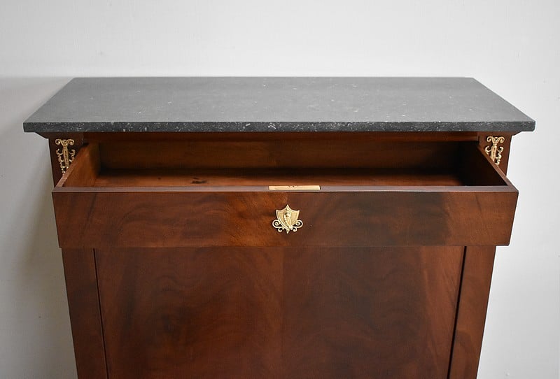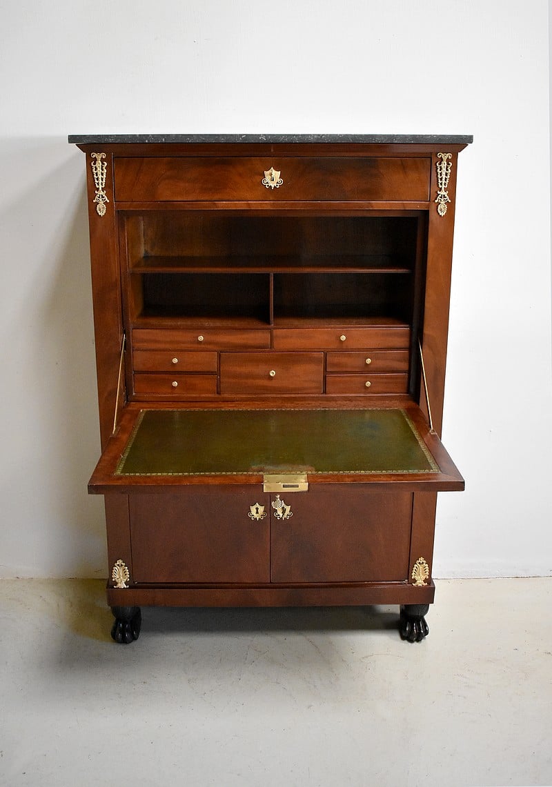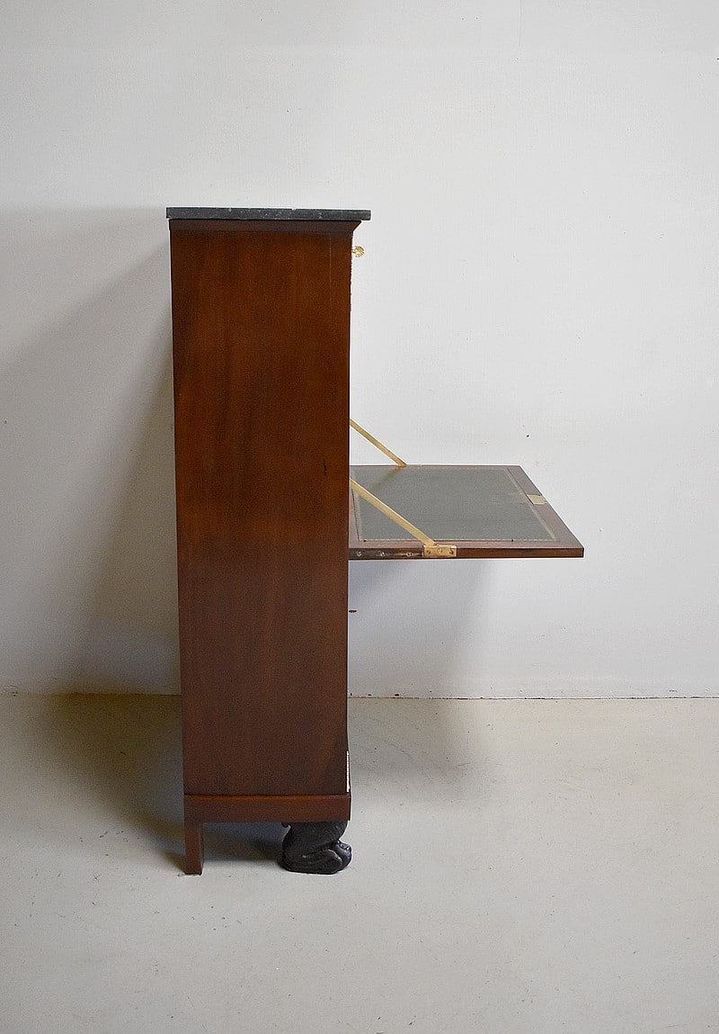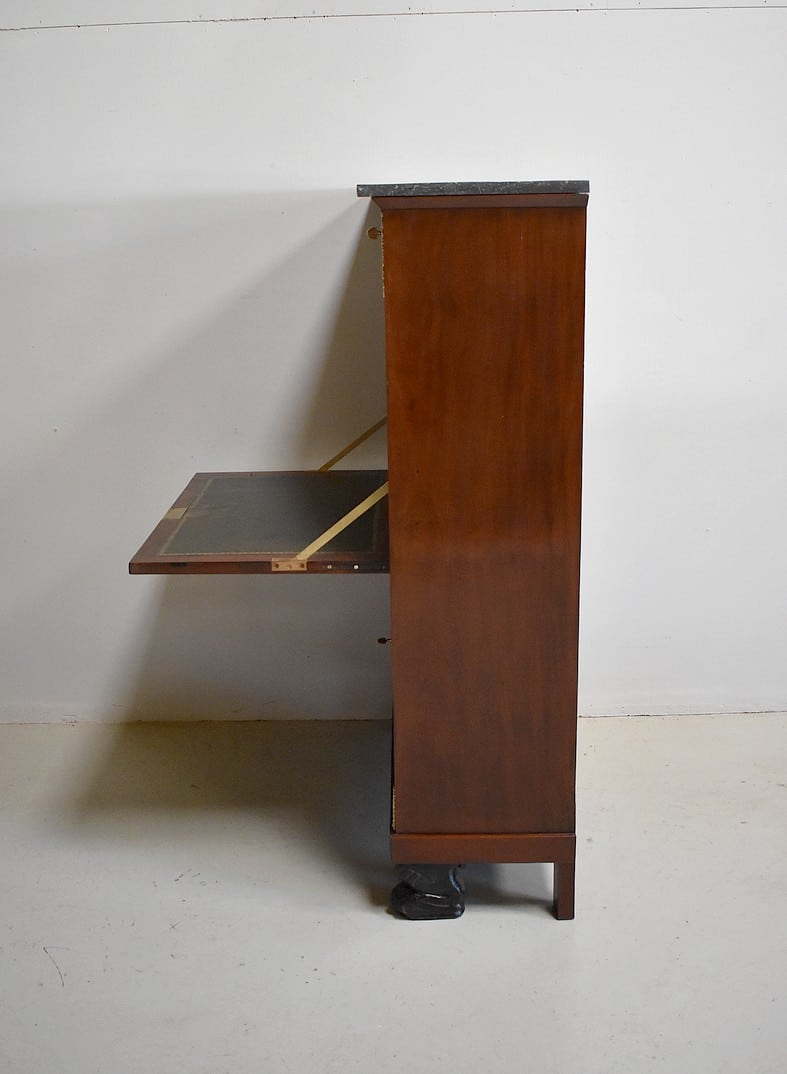 Secrétaire Directoire Retour d’Égypte en placage d’Acajou de fil et Ronce d’Acajou avec son dessus en marbre Granite Belge Anthracite.