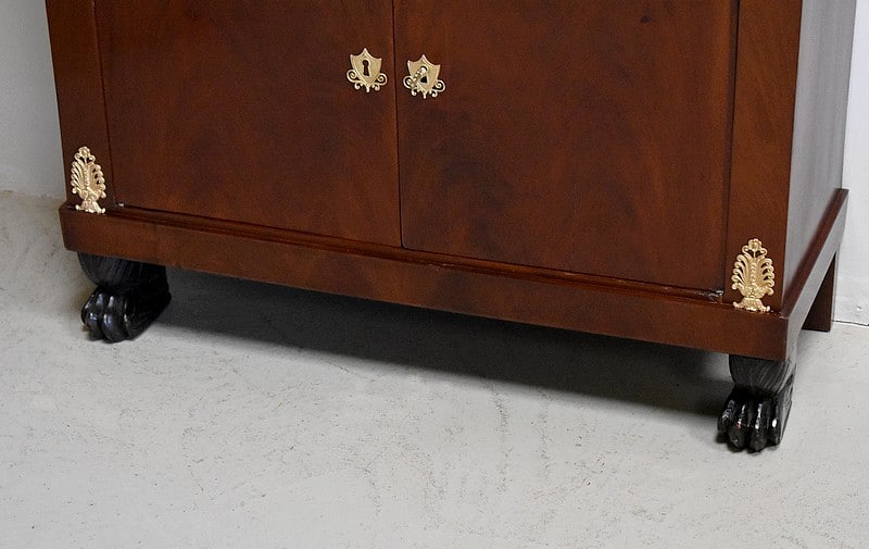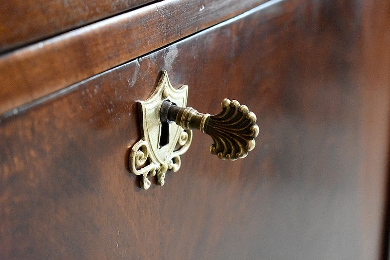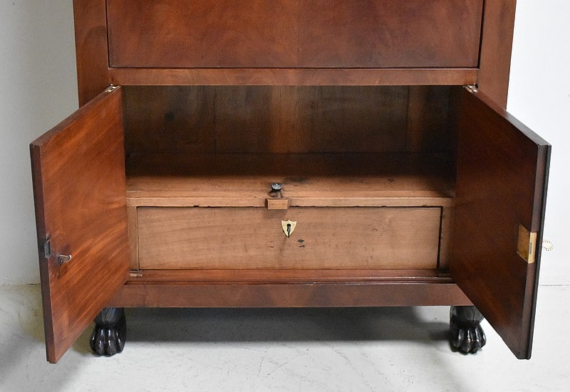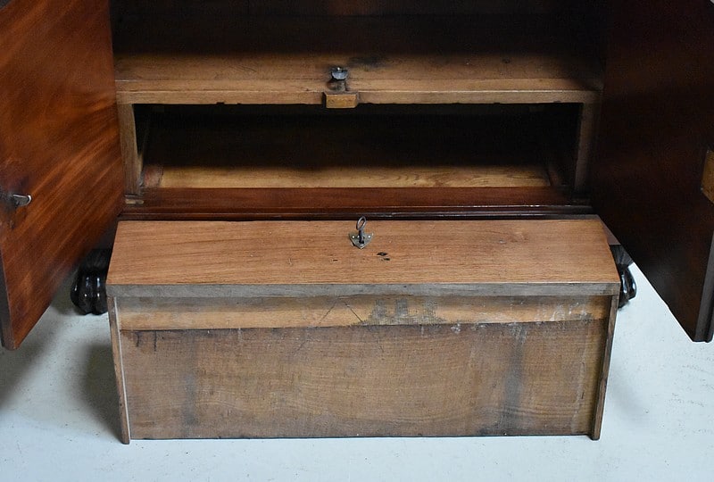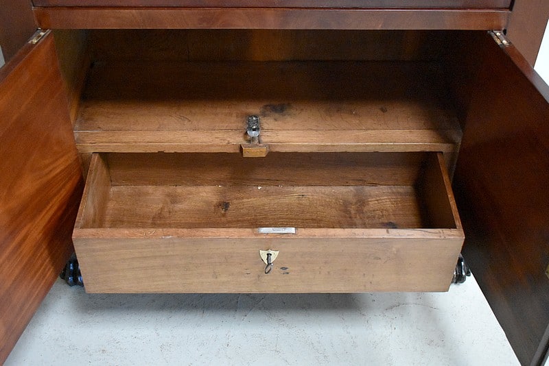 En partie basse du meuble, il ouvre également par deux portes fermant à clef et donnant accès à l’intérieur à un tiroir à serrure en partie basse et une grande niche au dessus. Toutes les serrures sont d’origine.