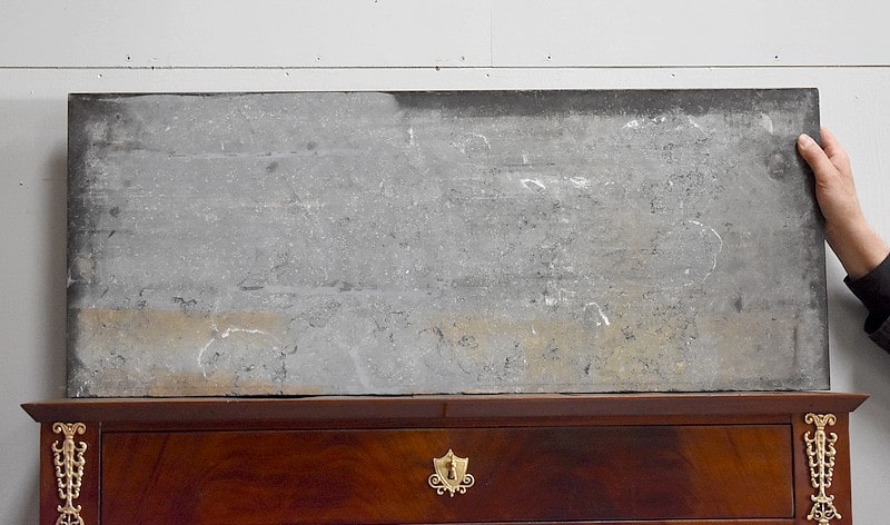 L’intérieur de l’abattant est recouvert d’un cuir ancien vert bronze rehaussé d’une frise dorée en pourtour.