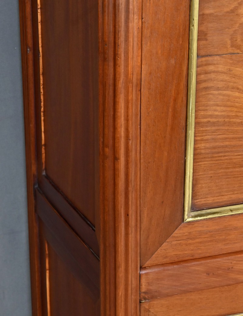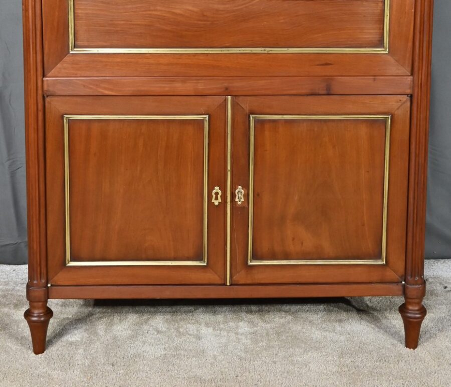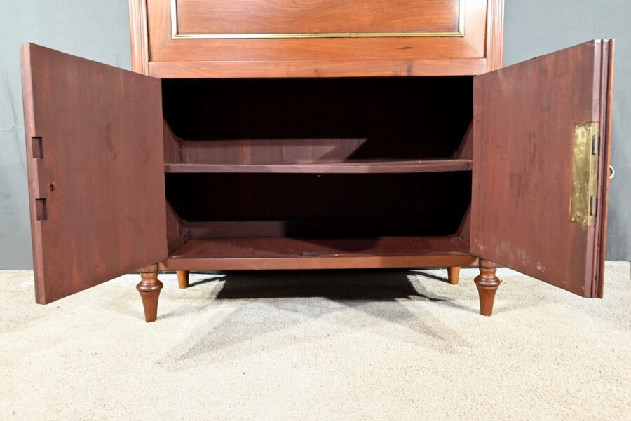 Ce meuble d’époque comporte, en partie basse, une double porte dans le même esprit et avec couvre-joint recelant une étagère.
