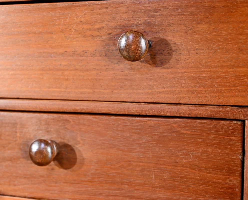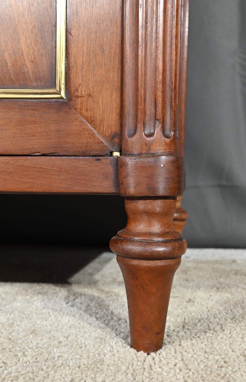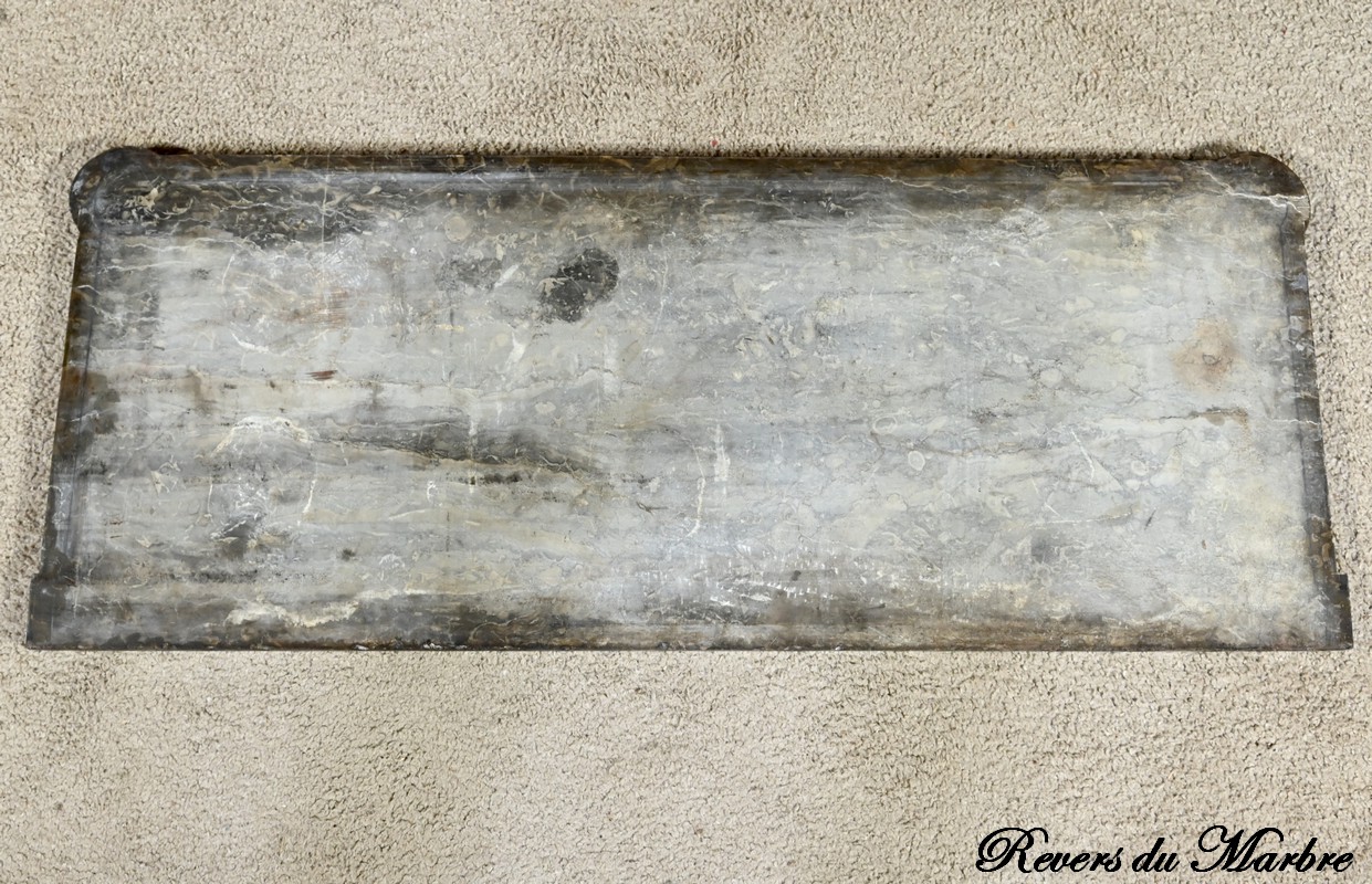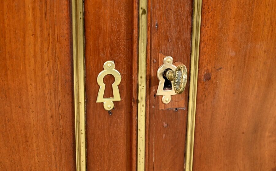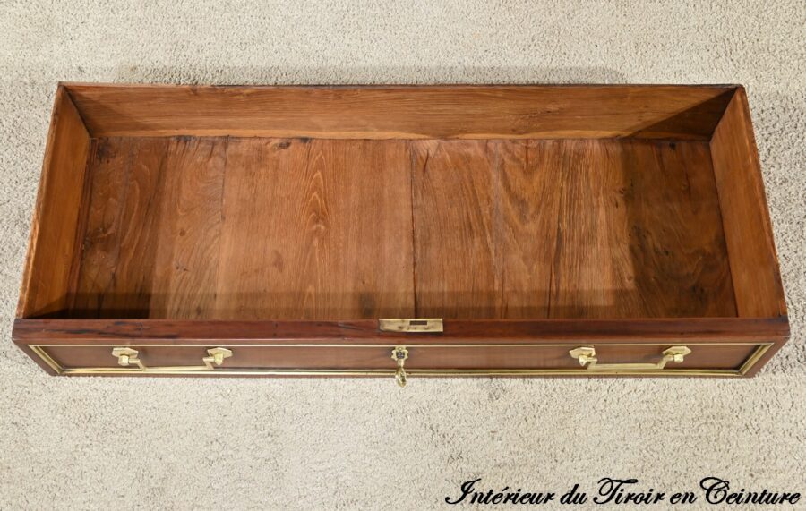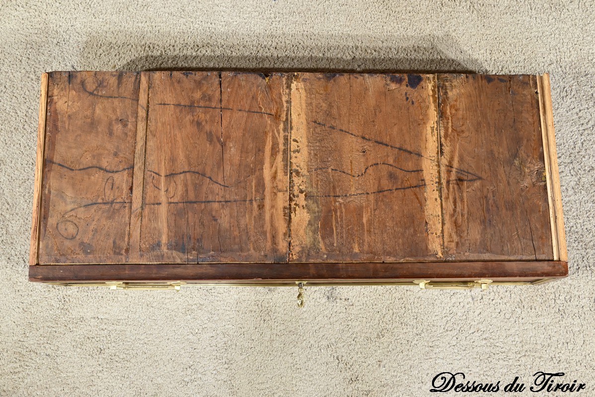 En dessous, l’abattant à cadre, foncé d’un seul panneau également à défoncement, est aussi équipé d’une serrure d’origine fonctionnelle avec entrée laiton.
