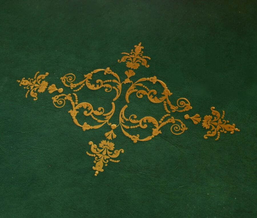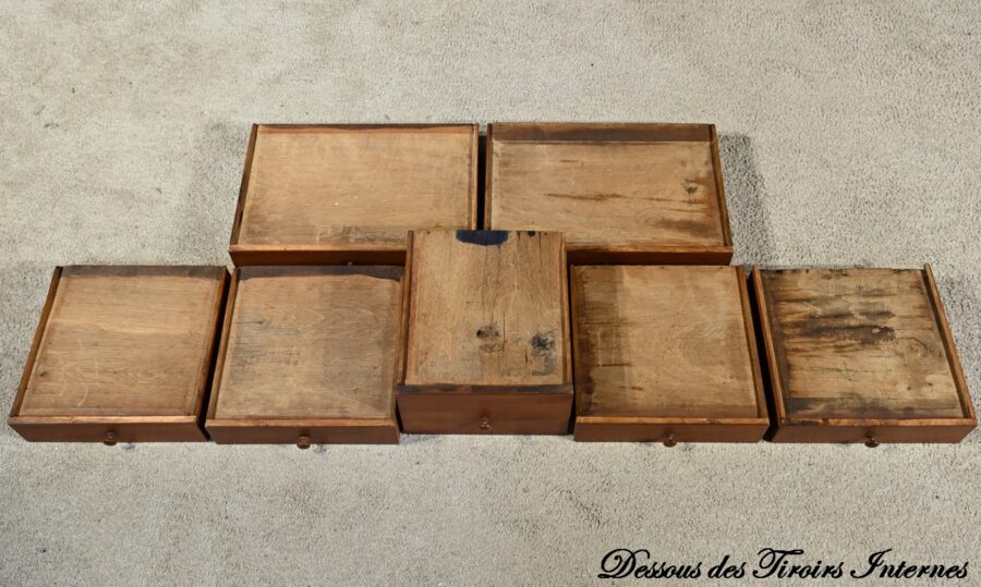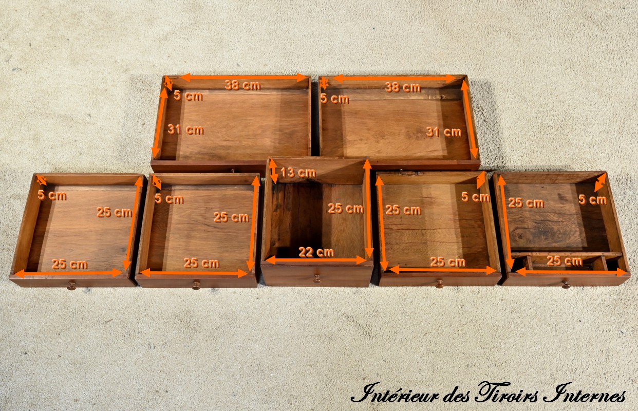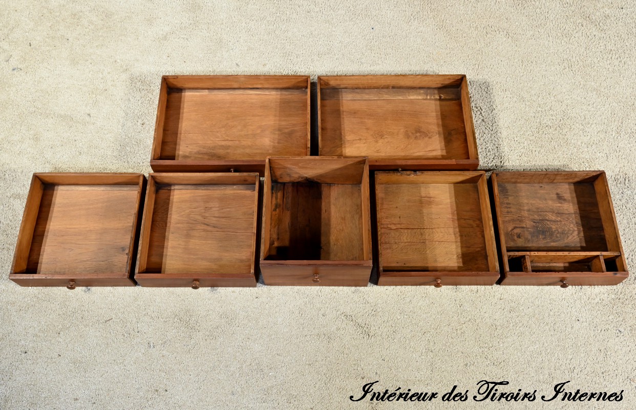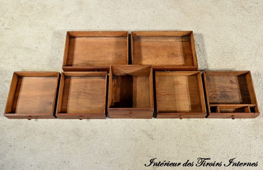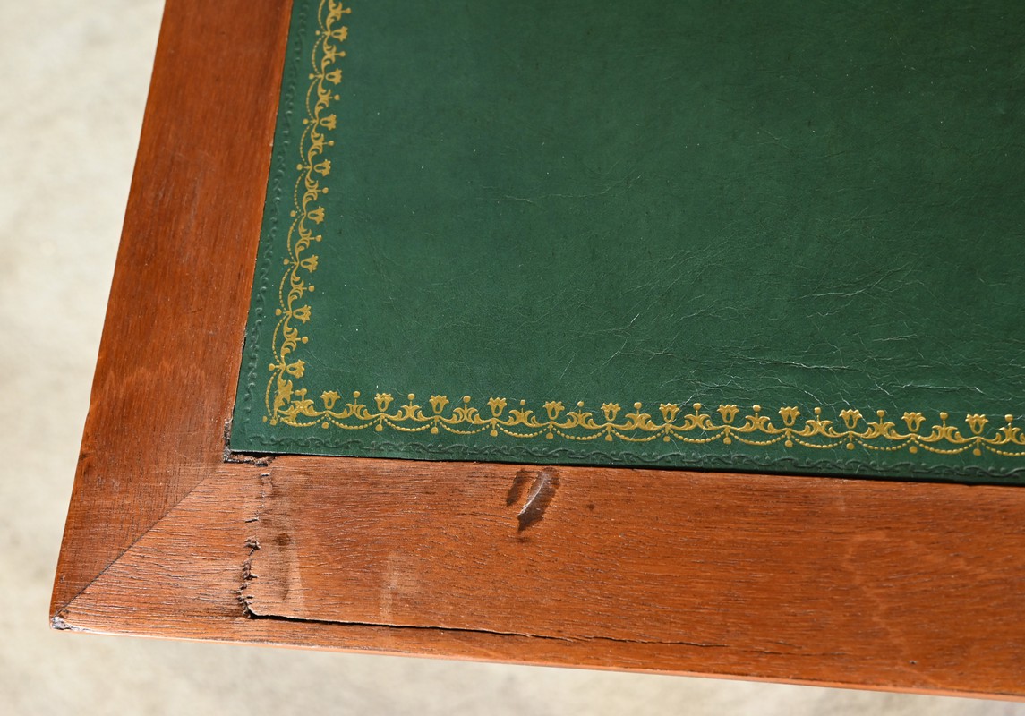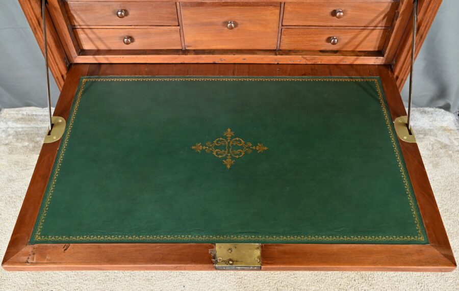 L’intérieur, foncé d’un cuir vert sapin postérieur avec motif central, vignette à froid et doré, propose sept petits tiroirs ainsi qu’une tablette offrant deux espaces de rangement identique.