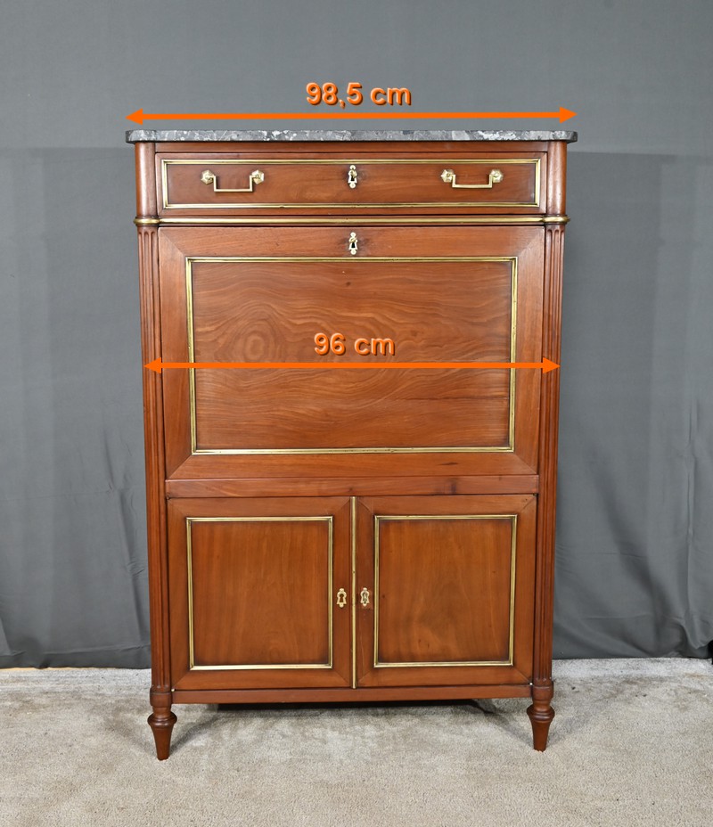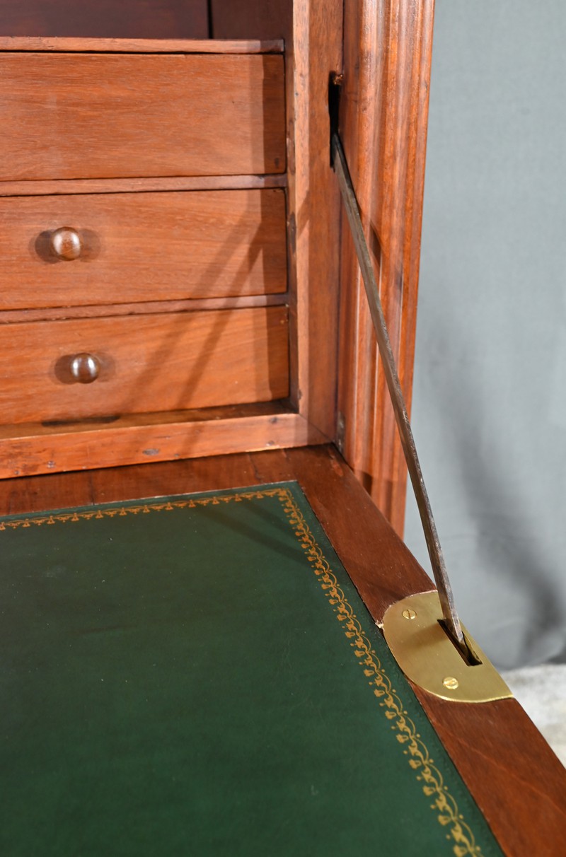 Ce secrétaire en acajou ouvre en ceinture par un tiroir à défoncement, souligné de baguettes laiton à doucine, munis d’une serrure authentique et de poignées tombantes.